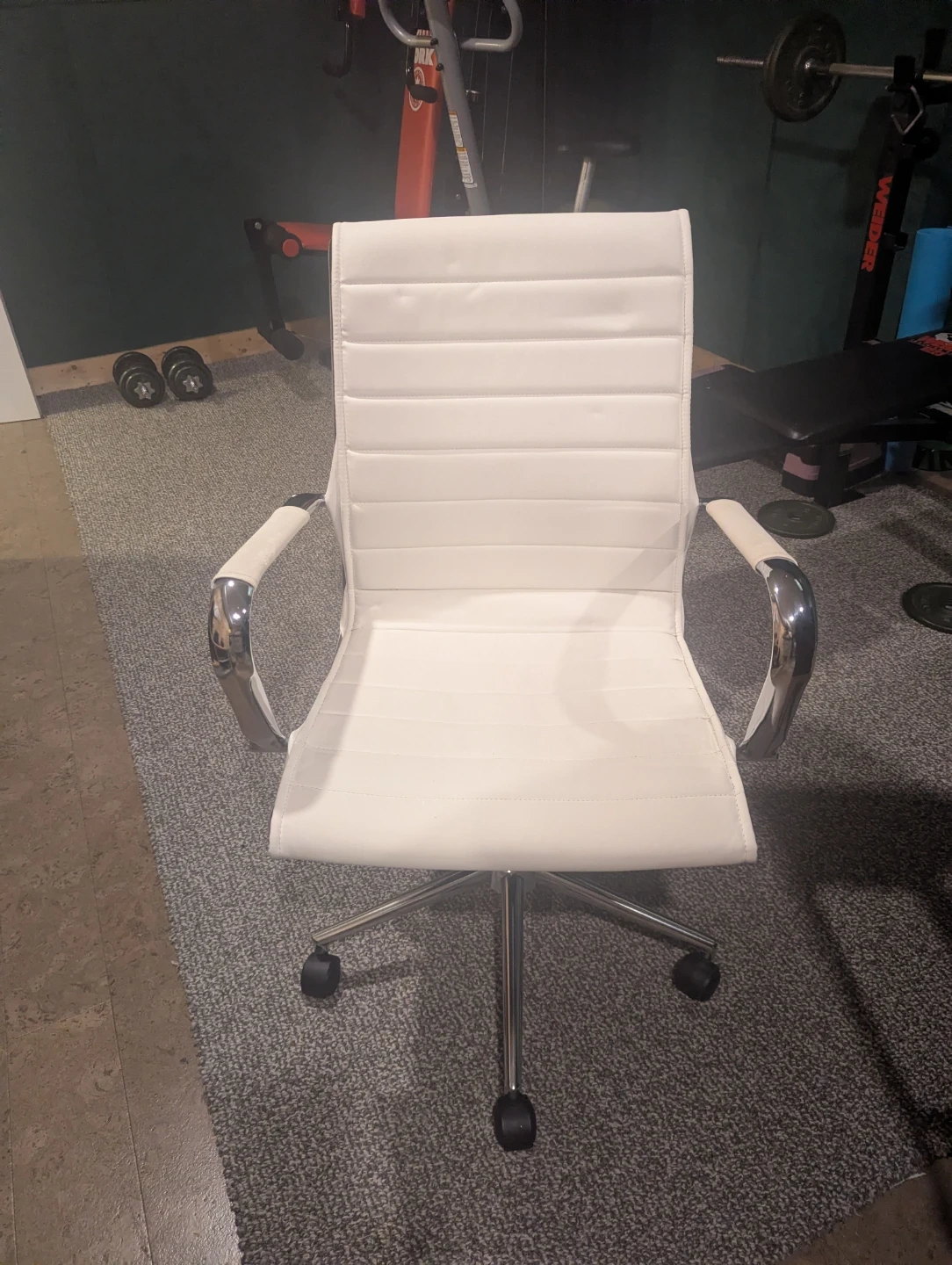 White faux leather office chair with chrome accents. It's got a ribbed design on the seat and back. Rolls smoothly on five wheels.