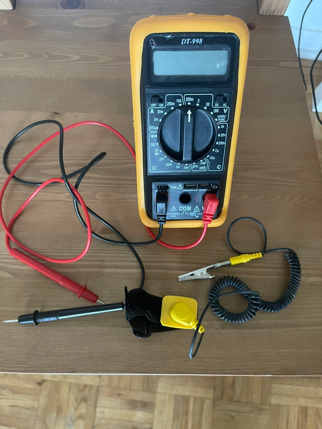This is a DT-998 digital multimeter. It measures AC/DC voltage, current, and resistance. Includes test leads and an anti-static wrist strap. NEW thanks