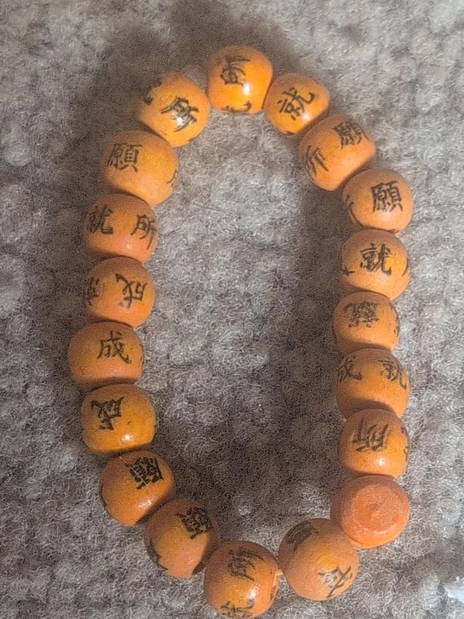This is a bracelet made of orange beads, each inscribed with Chinese characters. The beads appear to be made of wood or a similar natural material. It's a unique accessory for anyone interested in cultural or decorative jewelry.