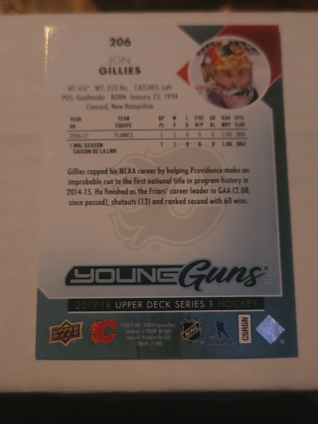 Selling a Jon Gillies Young Guns hockey card from the 2017-18 Upper Deck Series 1 Hockey collection. A great addition for any Flames fan or hockey card collector!