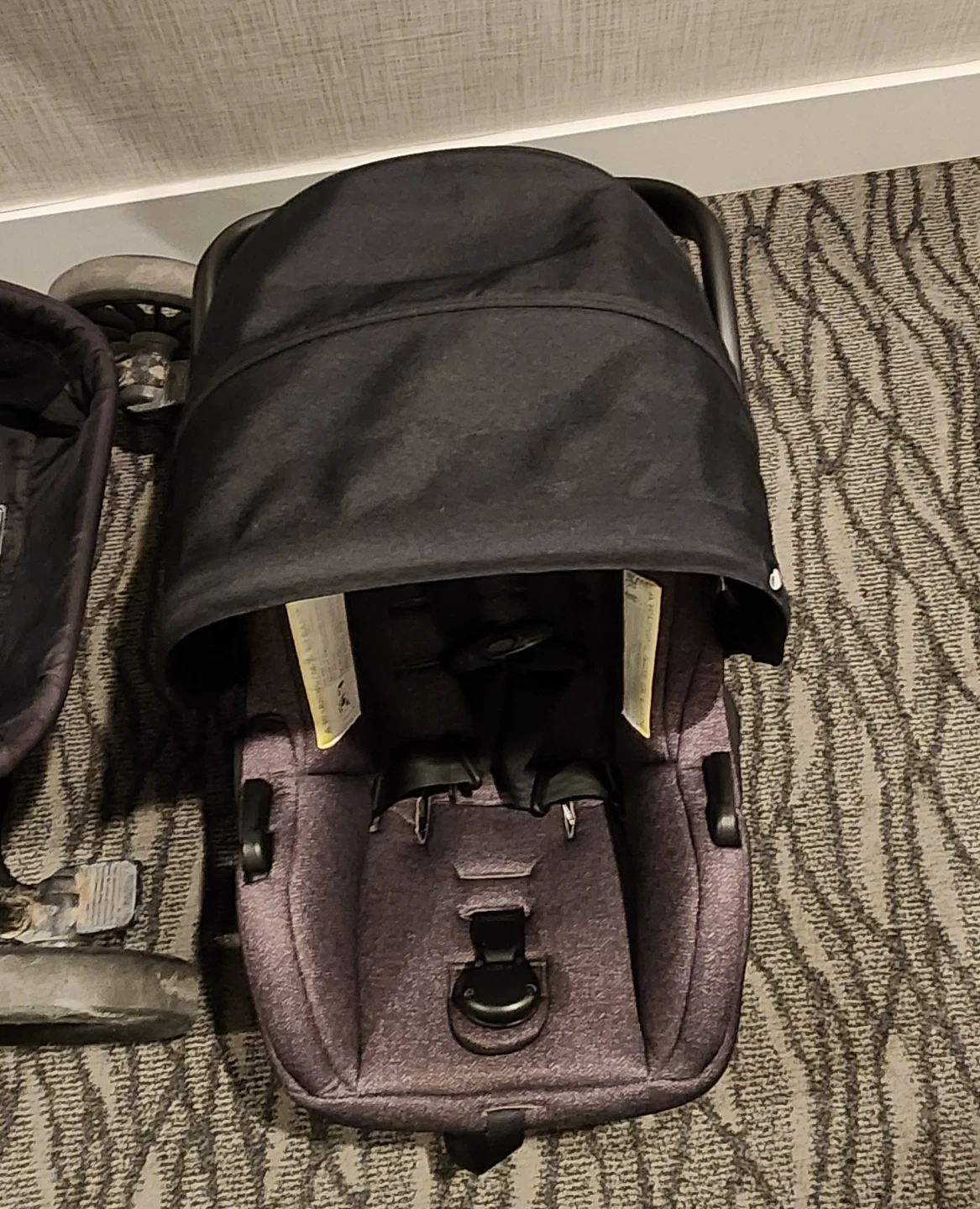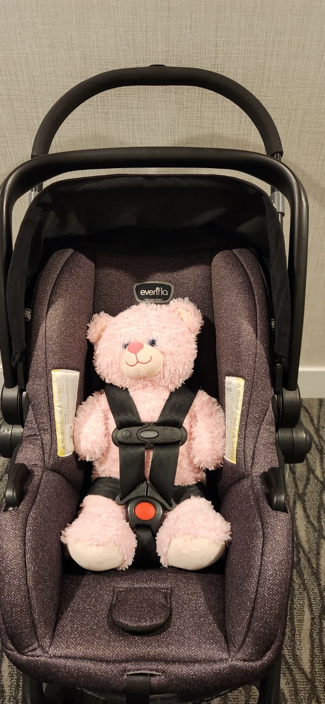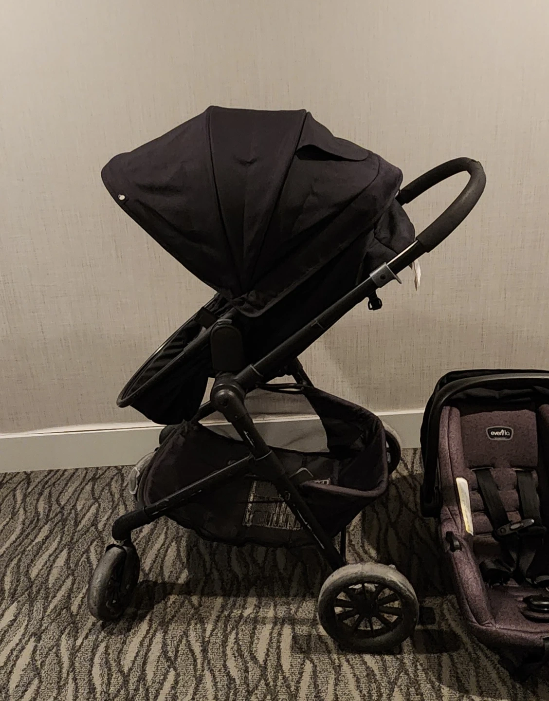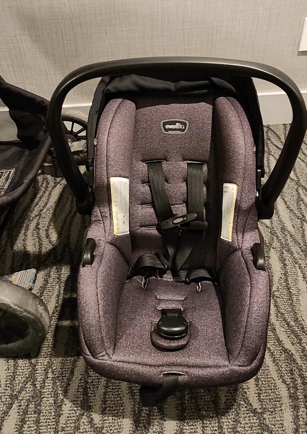 Black Evenflo stroller travel system. It includes a stroller and a car seat. Perfect for on-the-go parents!