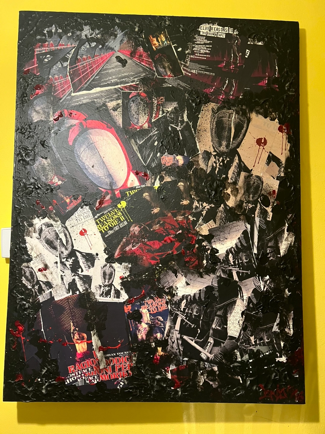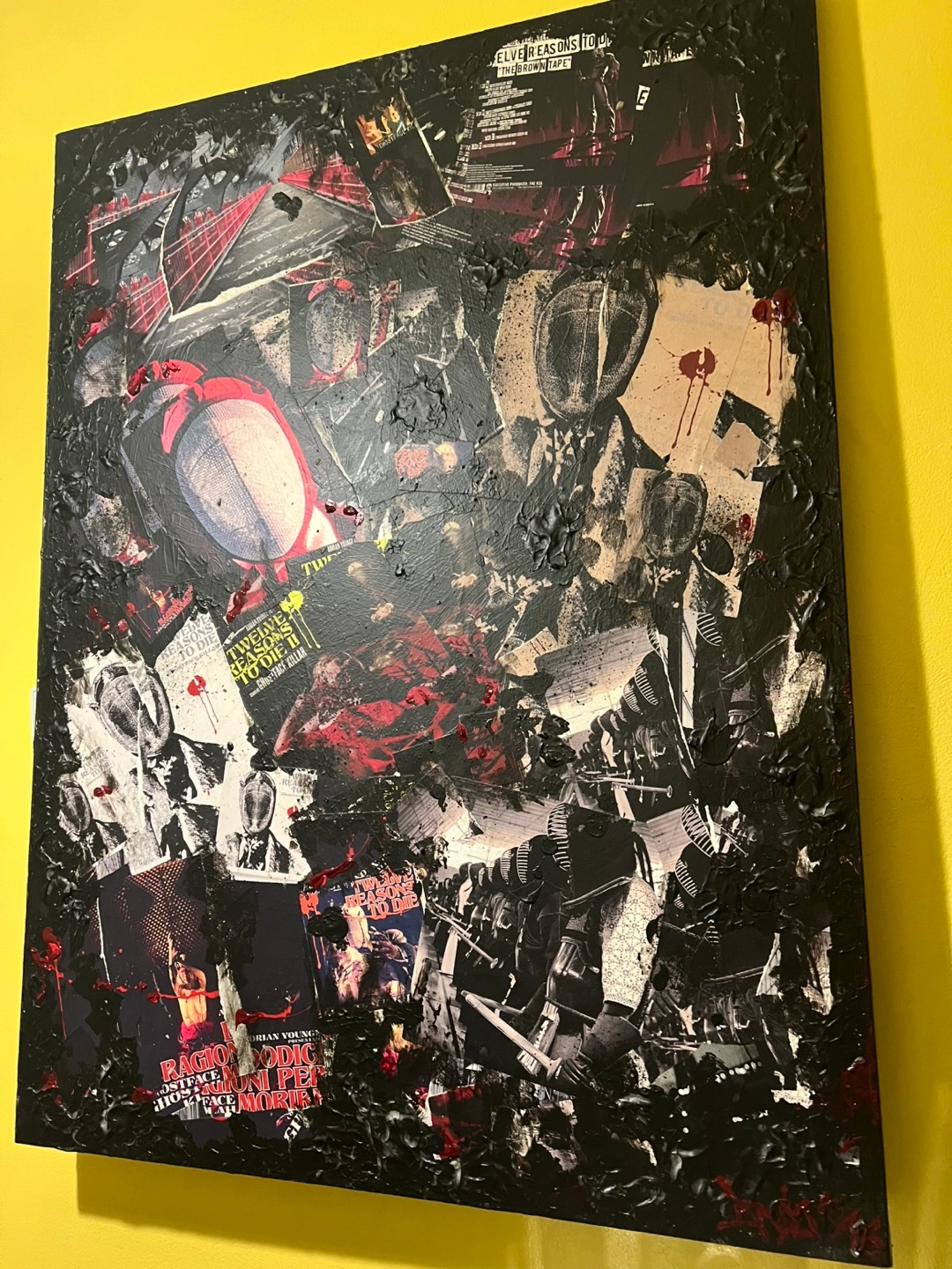 Unique mixed media collage artwork. Features a dark, abstract design with elements of print and texture. It's a striking piece for any collection..