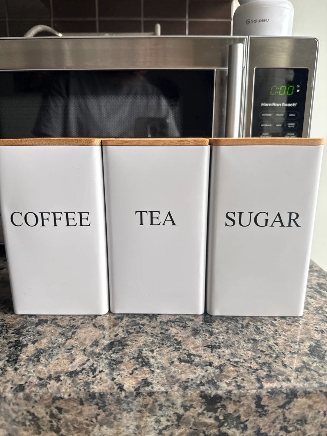 Set of 3 White Canisters (Coffee, Tea, Sugar) with Bamboo Lids
