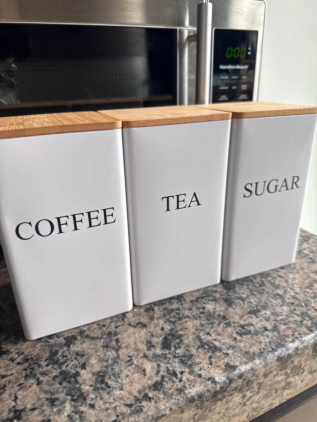 This set includes three white kitchen canisters labelled 'COFFEE', 'TEA', and 'SUGAR'. Each canister features a natural bamboo lid. They're great for keeping your dry goods organized and accessible on the countertop. The canisters are made of a durable metal. They're a stylish way to store staples!