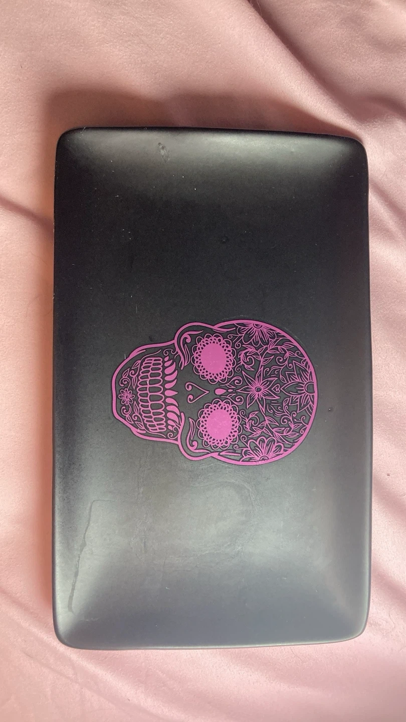 Black rectangular tray with a pink floral skull design. Dishwasher safe. Made of porcelain. It came from homesense and has not been used