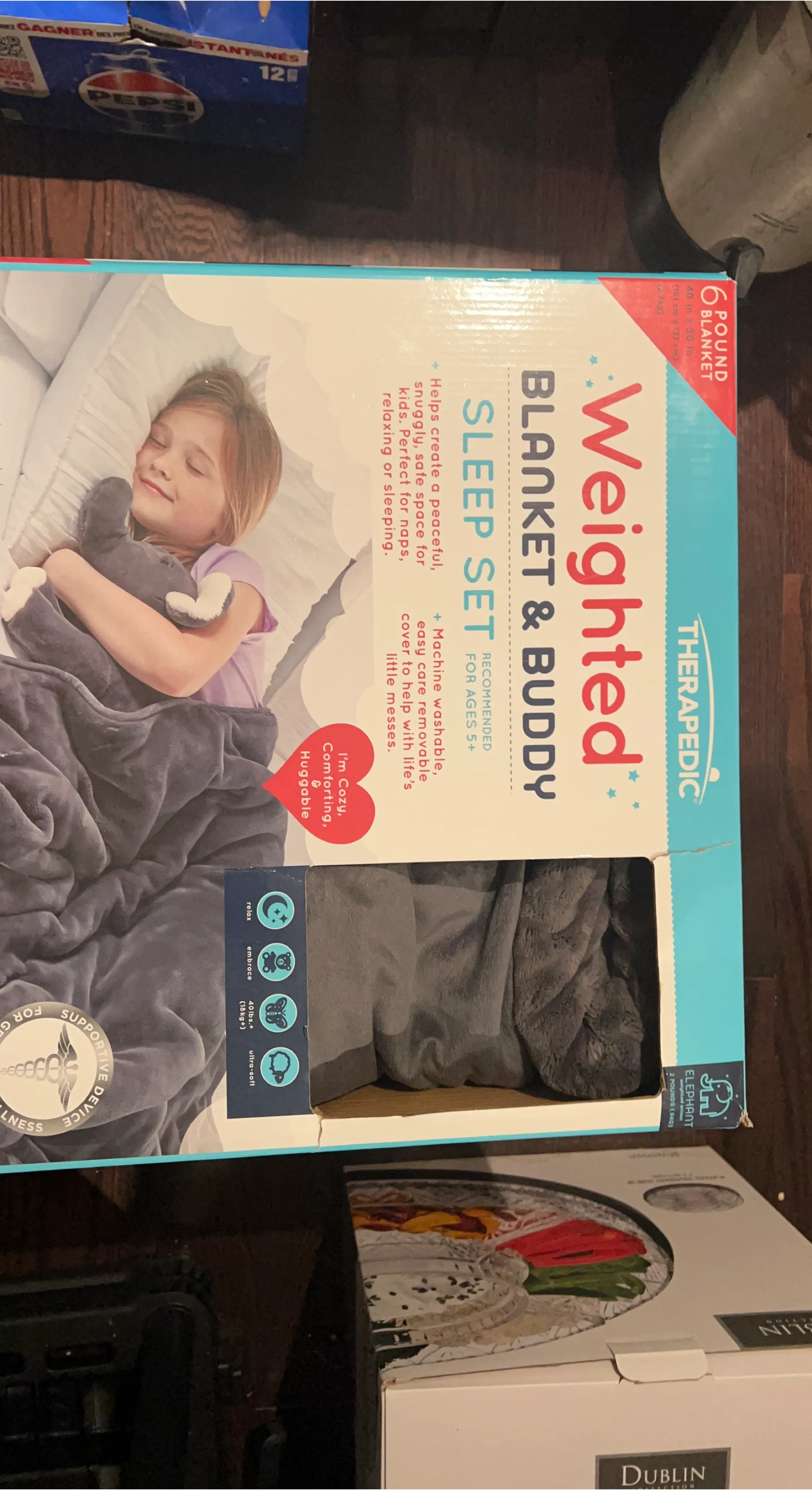 This Therapedic Weighted Blanket & Buddy Sleep Set is perfect for kids ages 5+. It helps create a peaceful, snuggly, safe space for kids, ideal for naps, relaxing, or sleeping. The machine-washable, easy-care removable cover helps with life's little messes. The blanket is 40 in x 50 in (101 cm x 127cm) and weighs 6 pounds (2.7kg). The buddy is a weighted elephant, weighing 2 pounds (.9KG).