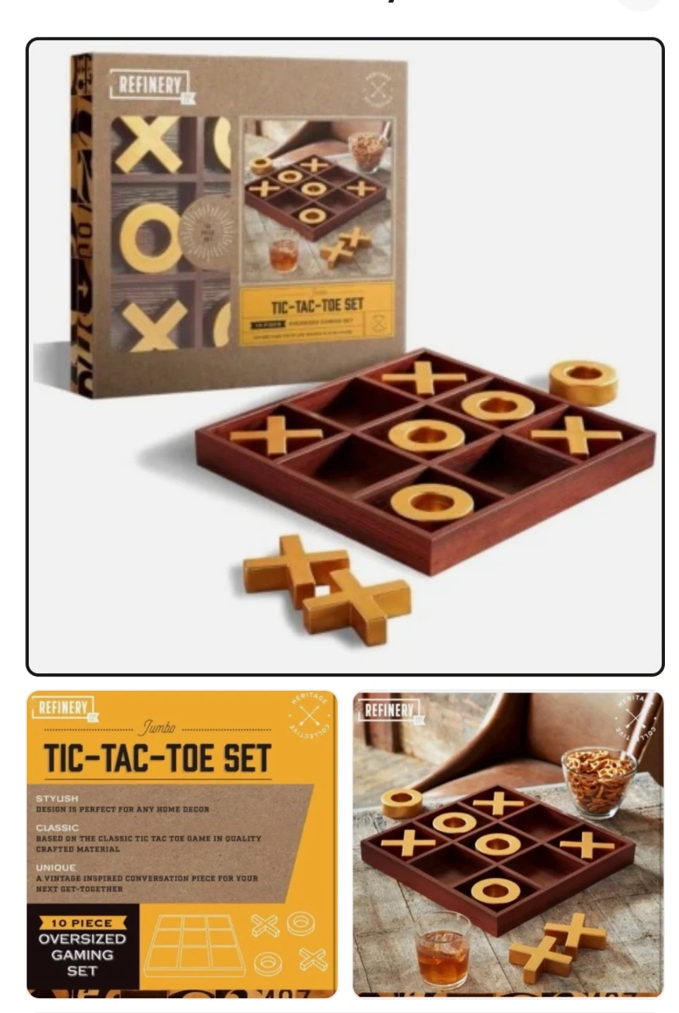 Spruce up your coffee table or any indoor area with this Refinery and Co. wooden tic-tac-toe board! This game features premium rustic solid wood design plus gold painted X and O pieces that'll add a charming accent to your office, home decor, for quick gift π or use for staging, all new in box.