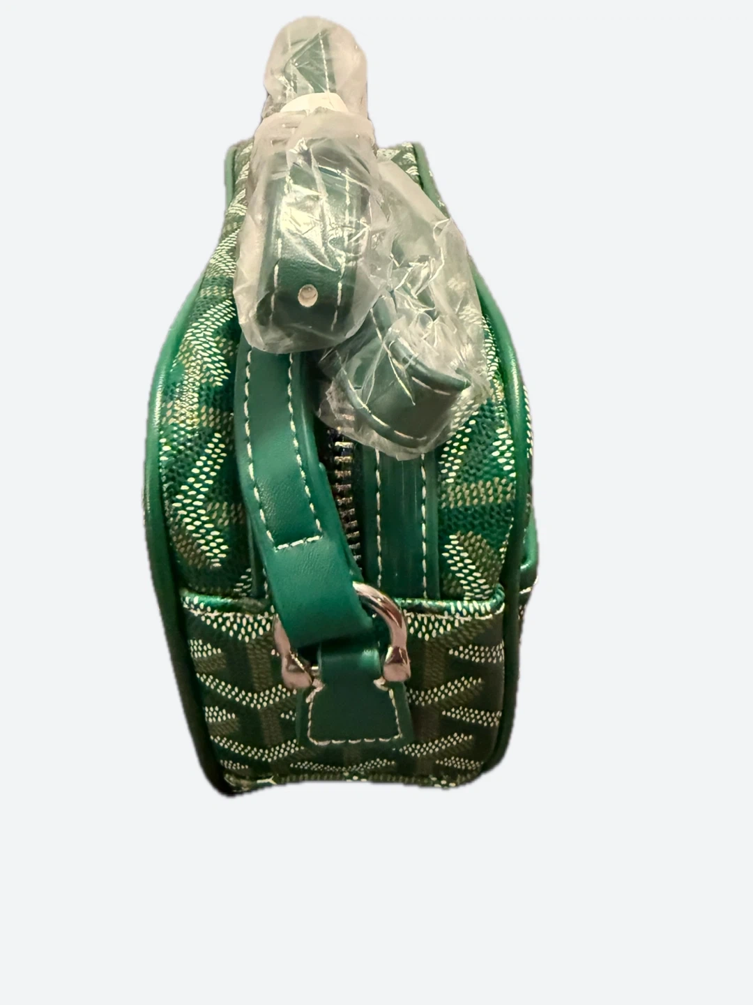 A green Goyard crossbody bag with the signature monogram pattern. It comes with a removable strap and a dust bag. This bag is made of durable coated canvas.