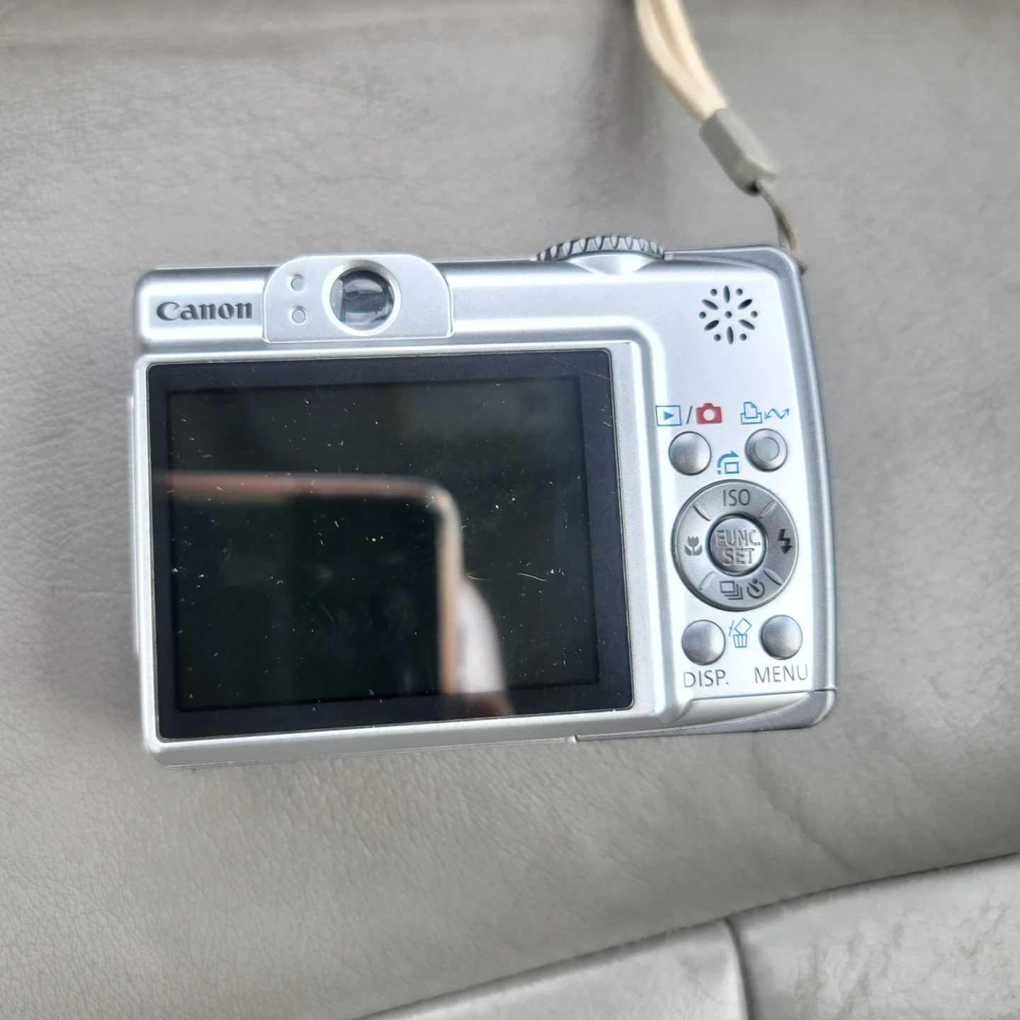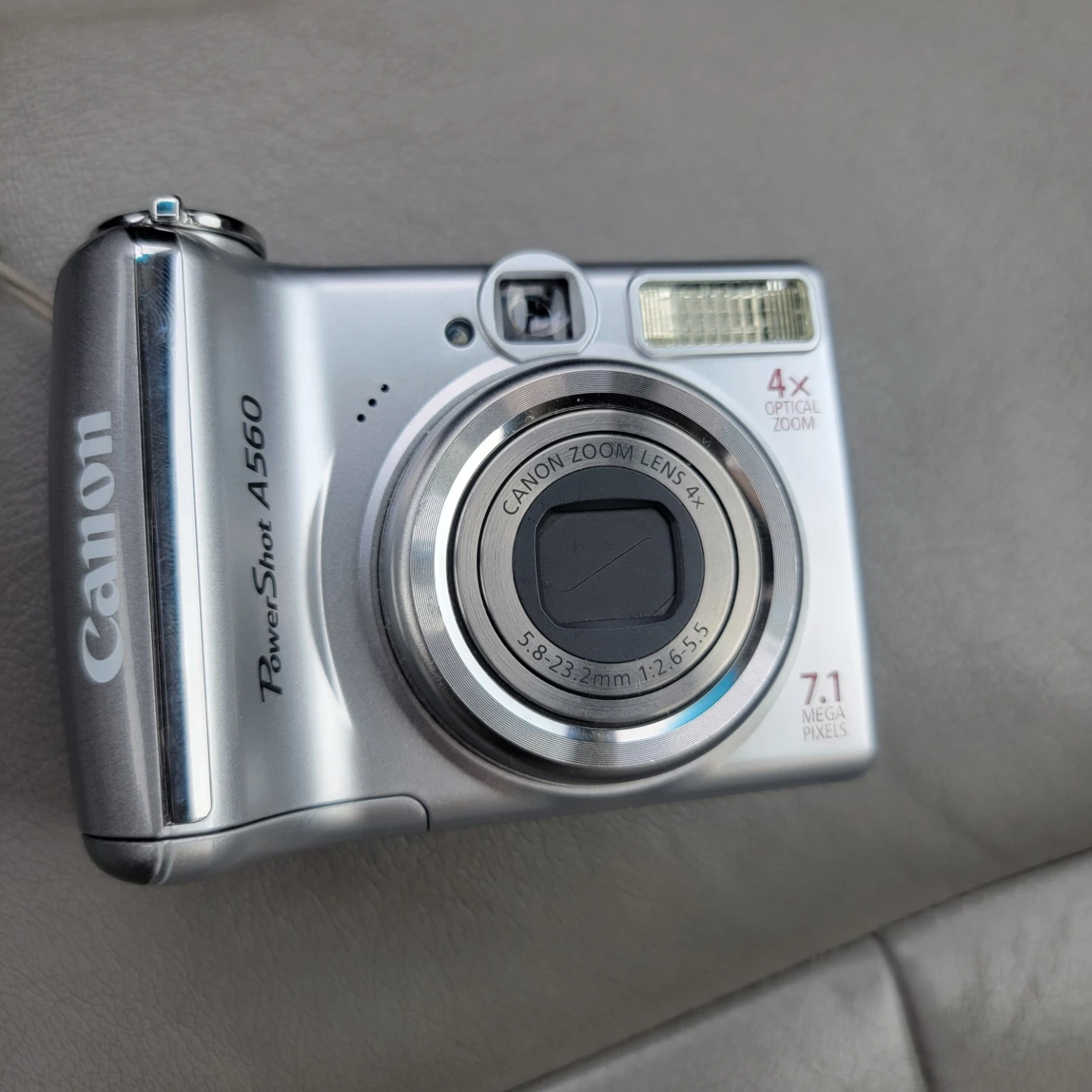 A silver Canon PowerShot A560 digital camera. It has a 7.1 megapixel sensor and 4x optical zoom. Great for everyday photos!