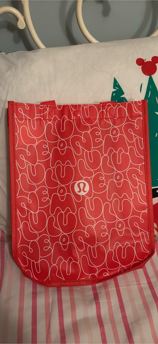 This is a Lululemon reusable bag. It's red with a white wavy pattern. Great for groceries or carrying essentials!