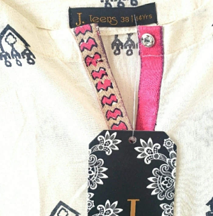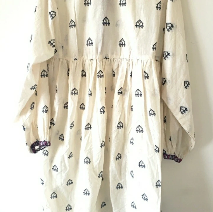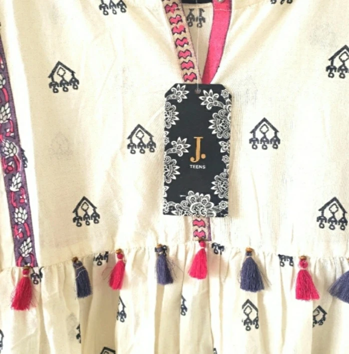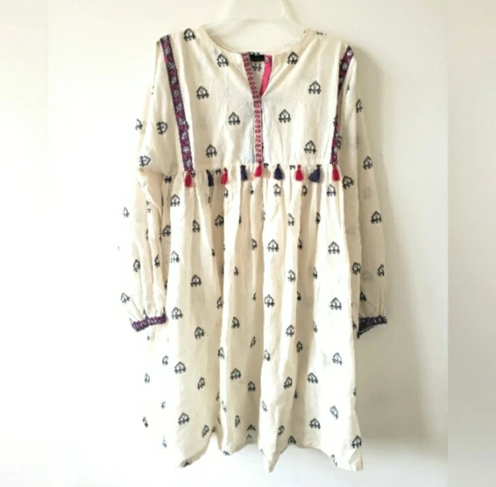 Cream-coloured kurta/tunic top. Features long sleeves, embroidered detailing, and colourful tassels. V-neck design. Size 38/14 years. New with tags.