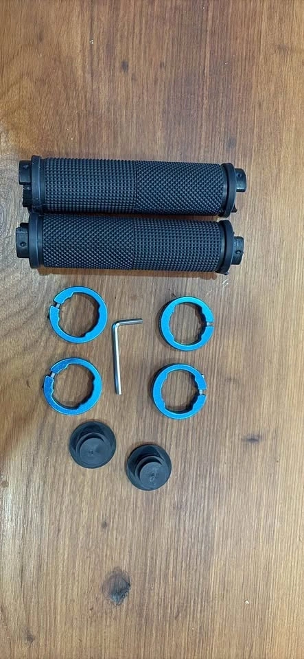 High-quality rubber grips with a non-slip patterned surface for durability and comfort. This set has double aluminum alloy locking rings to prevent loosening and provides shock resistance. Includes two rubber and aluminum end caps plus an Allen wrench for easy installation. The lightweight pair weighs 116g and fits handlebars with a 20-22mm outer diameter. Works for BMX, mountain bikes, scooters, and cruisers.