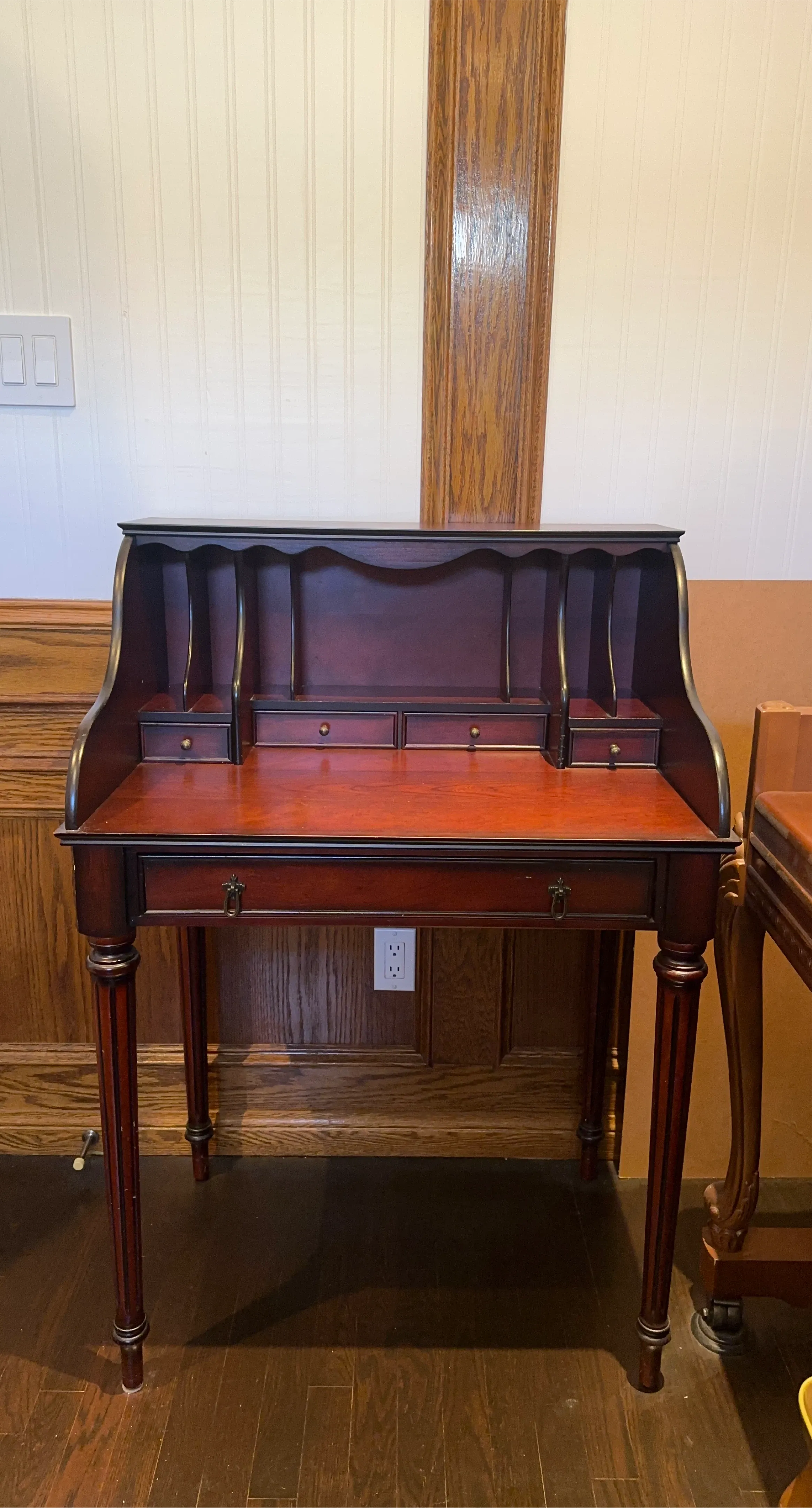 A beautiful cherry wood secretary desk with multiple drawers and compartments. It features an elegant design with fluted legs and decorative hardware. Perfect for a home office or study.