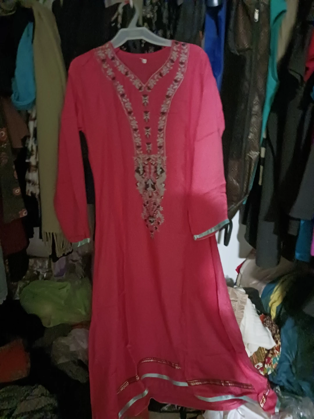 This is a pink kurti with embroidered details on the neckline and sleeves. It comes with matching pink pants. The fabric appears to be lightweight.
