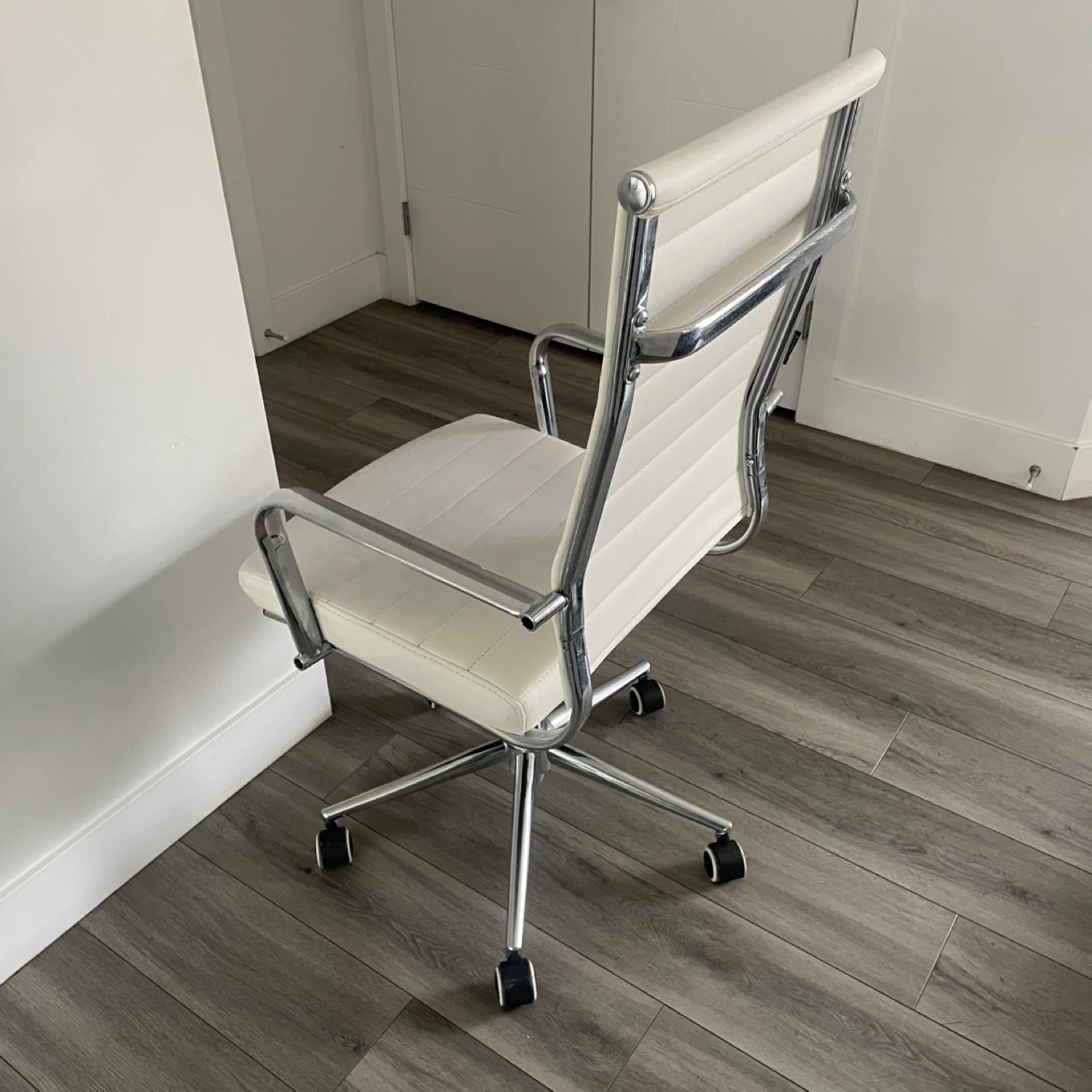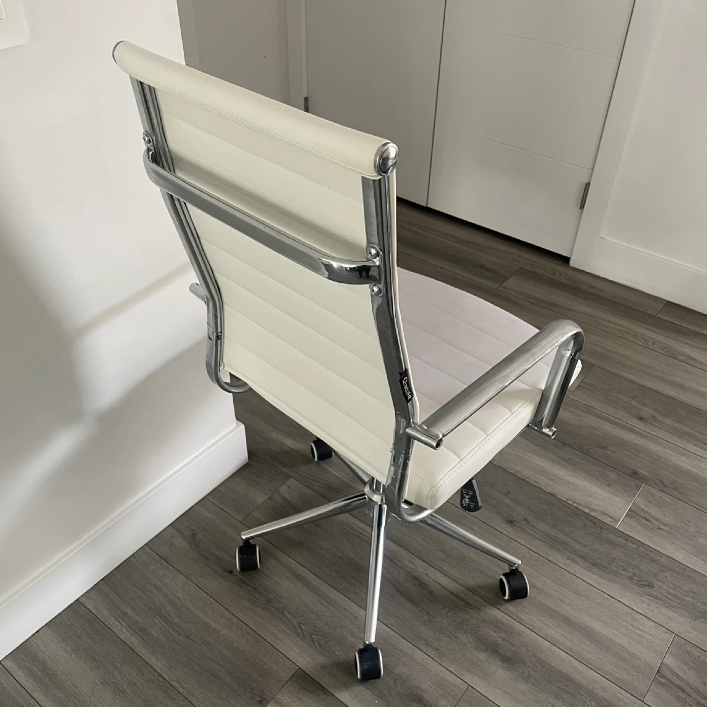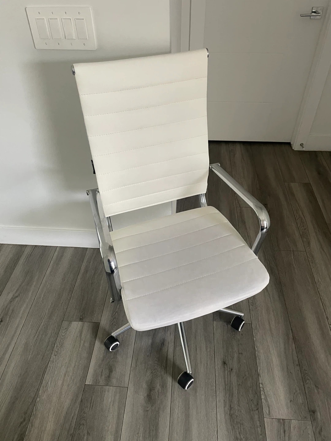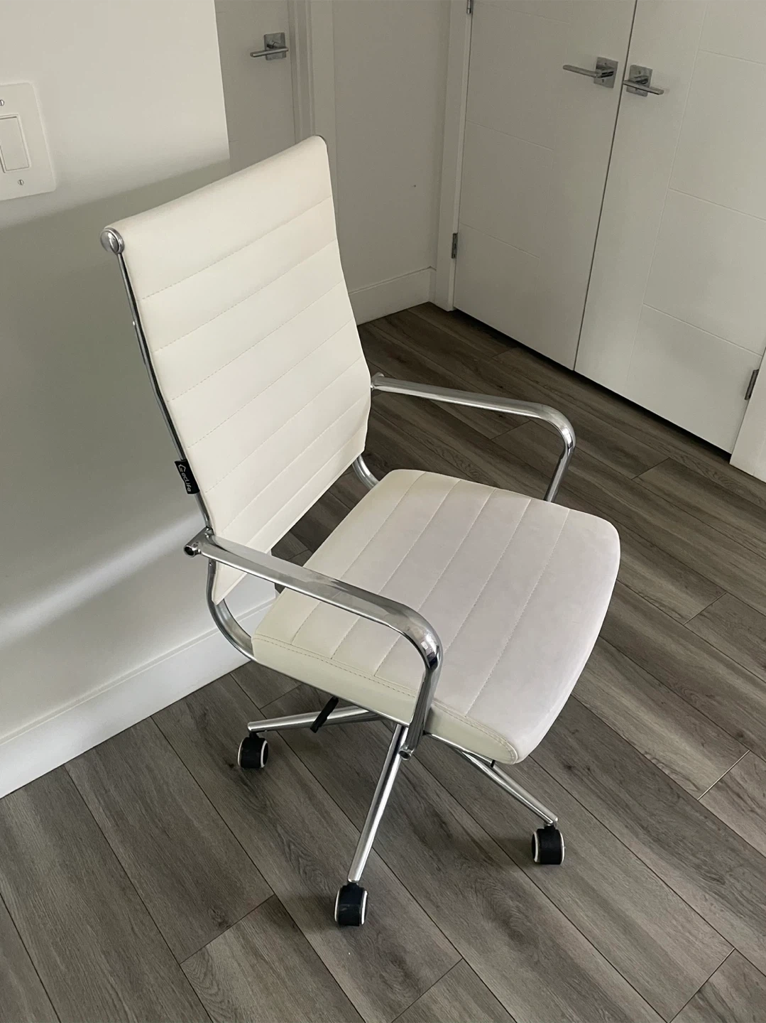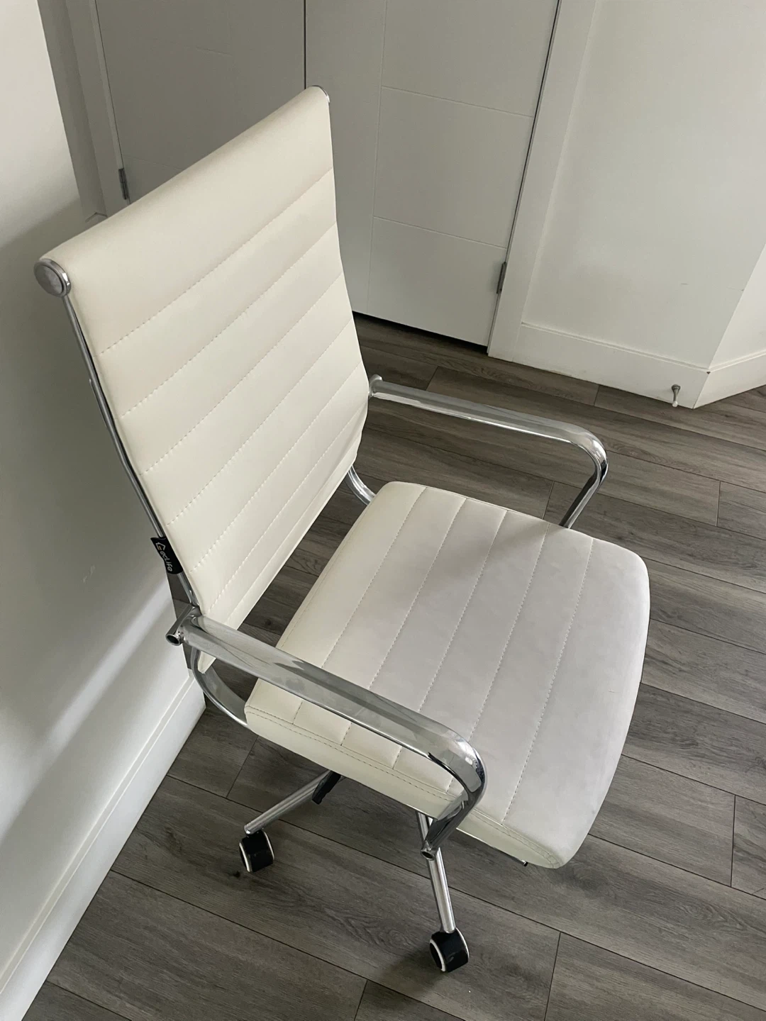 White Faux Leather Office Chair. Chrome Base And Arms, Adjustable Height. In Good Shape Has Wear As Shown In The Pictures.