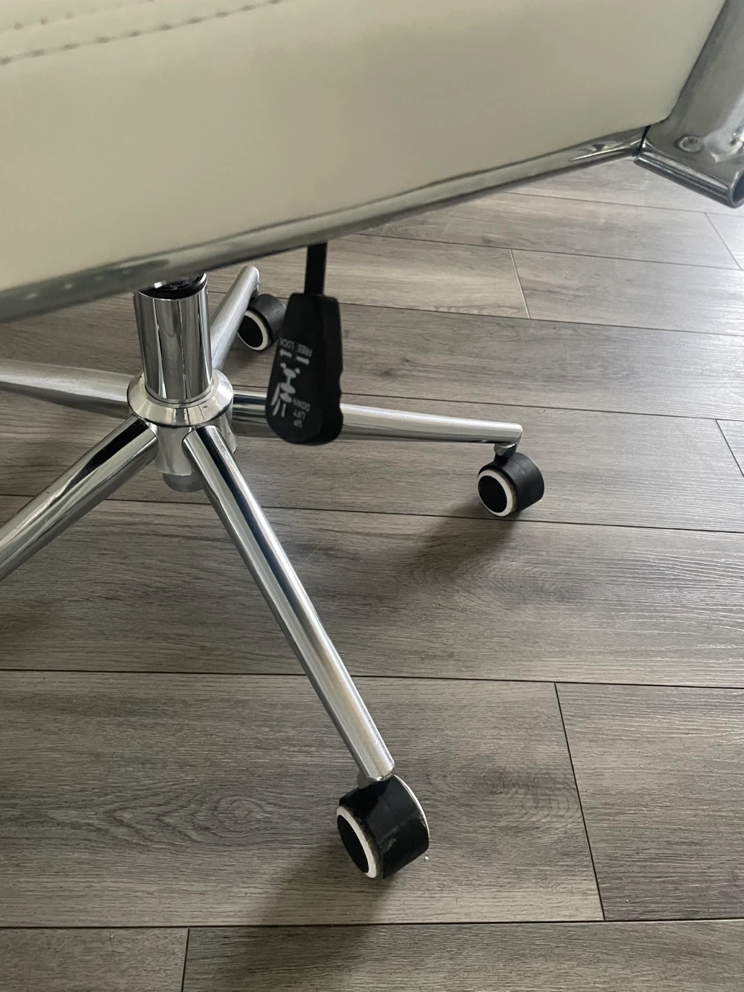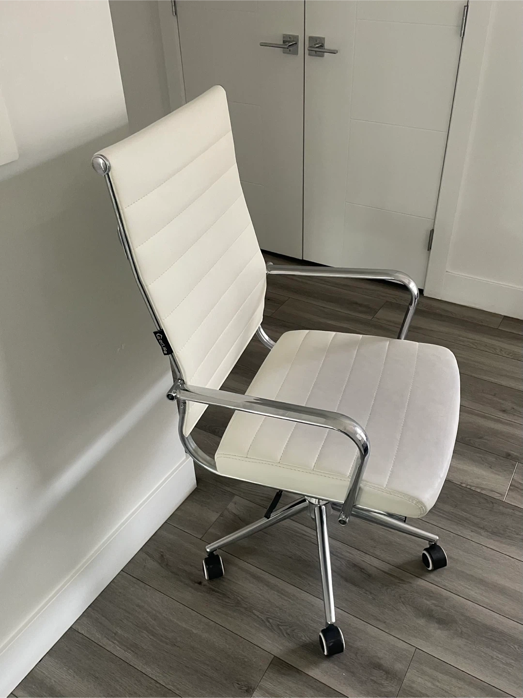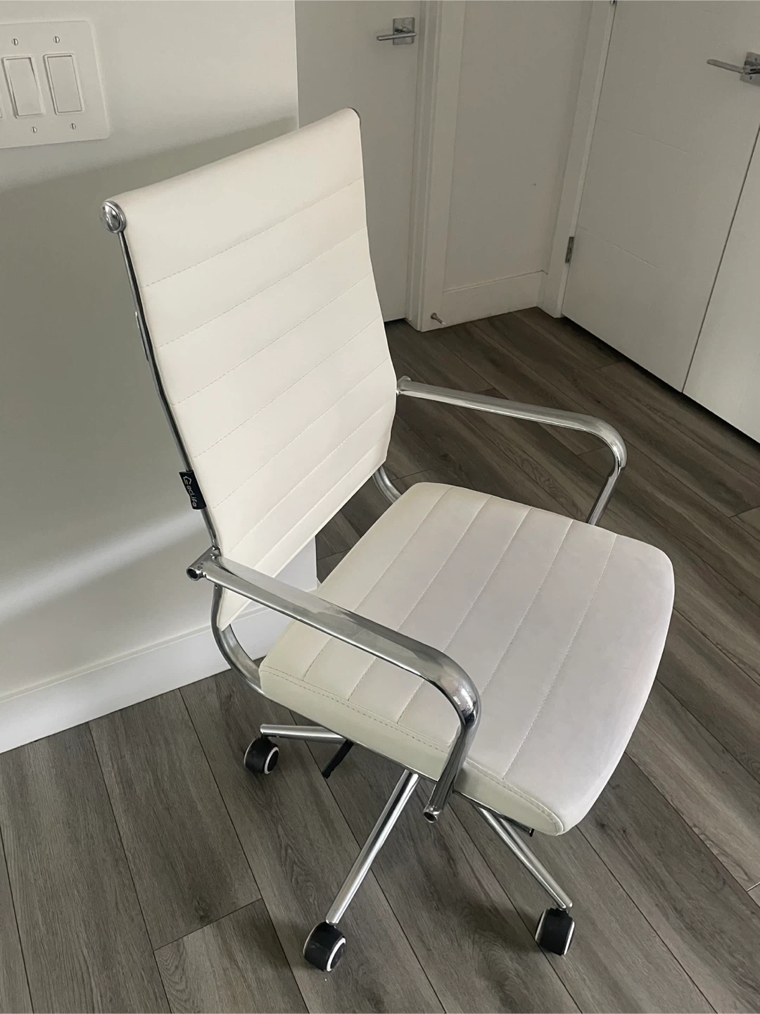 White Faux Leather Office Chair. Chrome Base And Arms, Adjustable Height. In Good Shape Has Wear As Shown In The Pictures.