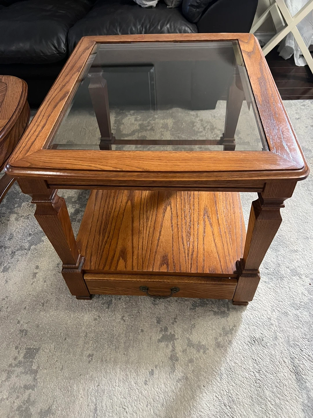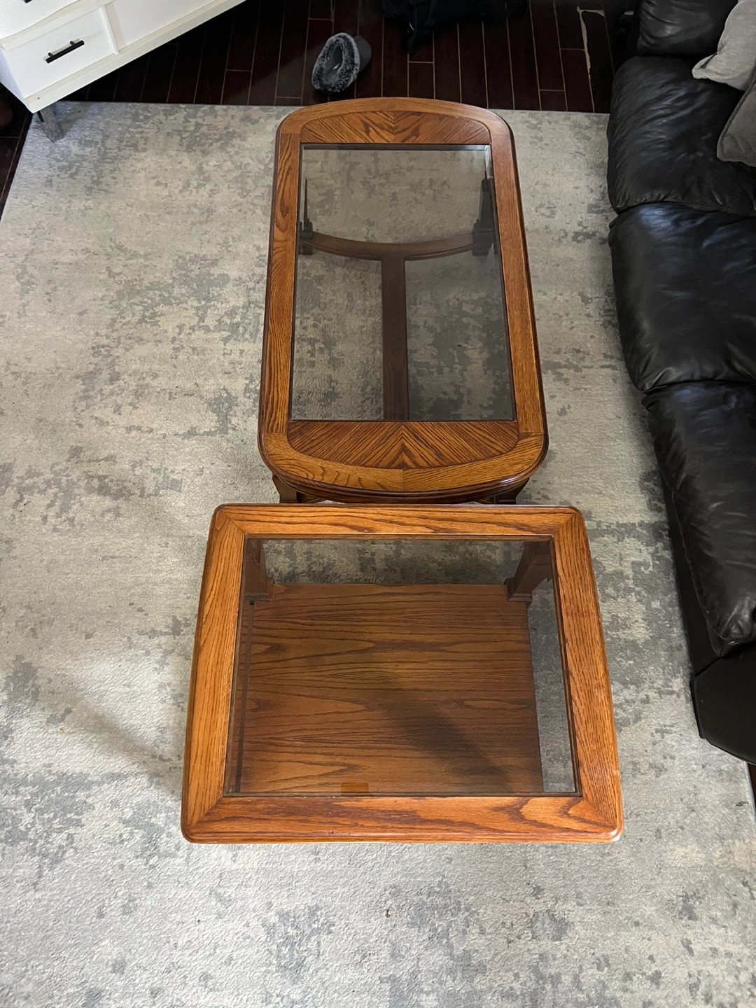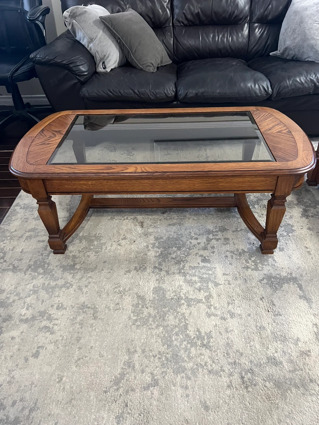 A nice matching solid pine coffee table and end table with a glass insert. It's a sturdy piece of furniture, coffee table is 46Lx26Wx16H. End table is 27Lx22Wx21H.