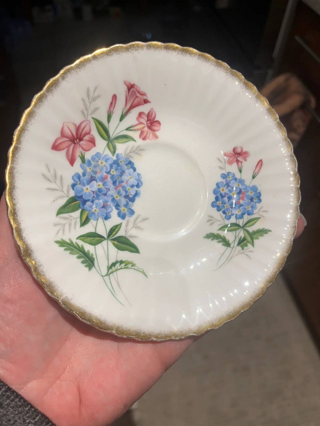 This is a vintage Paragon fine bone china saucer. It features a delicate floral pattern with blue and pink flowers, accented by a gold rim. This elegant piece is perfect for afternoon tea or as a decorative item.