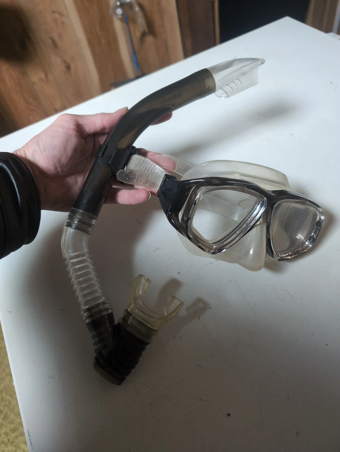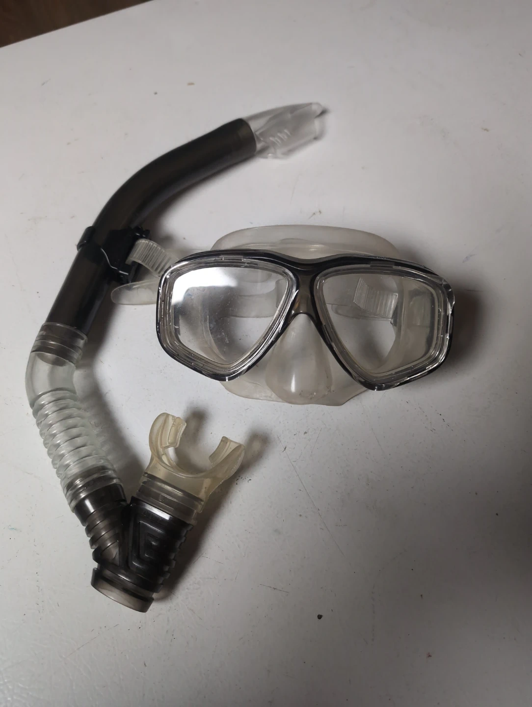 This set includes a clear scuba mask and a black snorkel. The mask features adjustable straps for a snug fit. It's ready for your next adventure under the water!