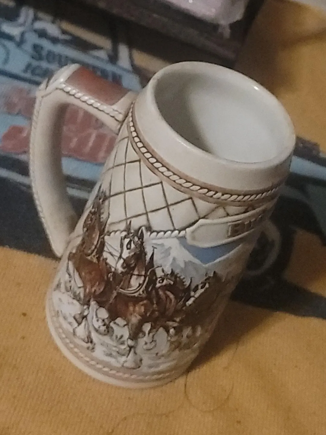 Selling a Budweiser Clydesdales stein mug. It features a detailed design of the iconic Clydesdale horses, perfect for collectors or beer enthusiasts. It's in great condition and ready for a new home!