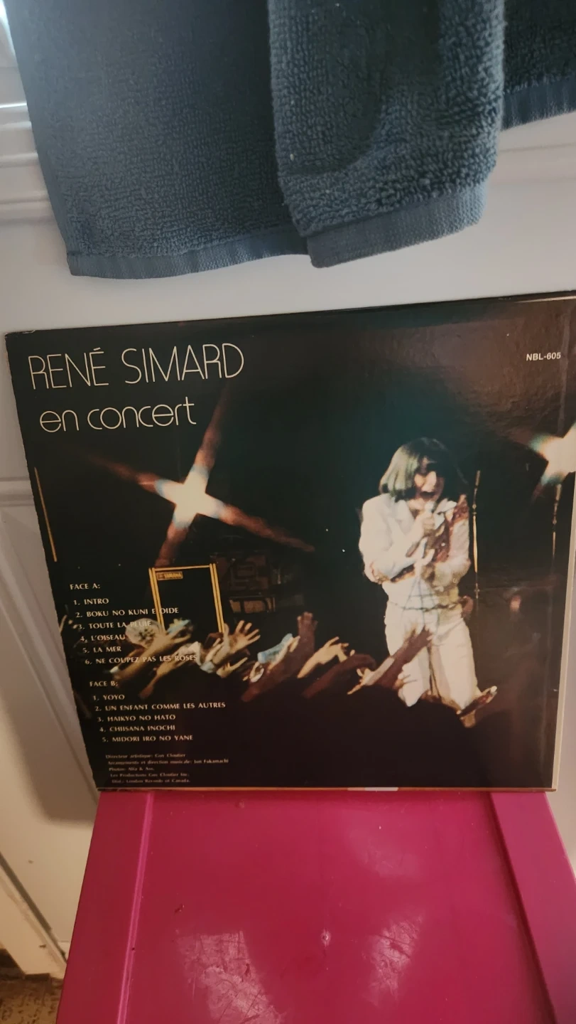 René Simard en concert vinyl record from London Records of Canada. Features songs like 'Boku No Kuni E Oide' and 'La Mer'. This is a vintage music collectible.