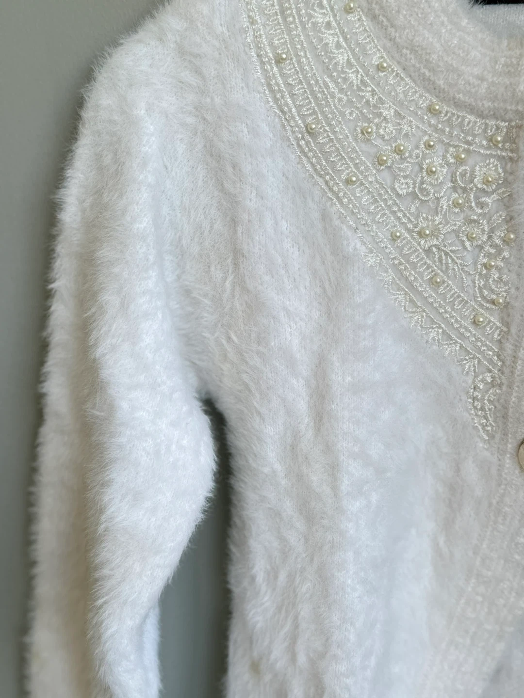 Features delicate beadwork and pearl-like buttons on the neckline.