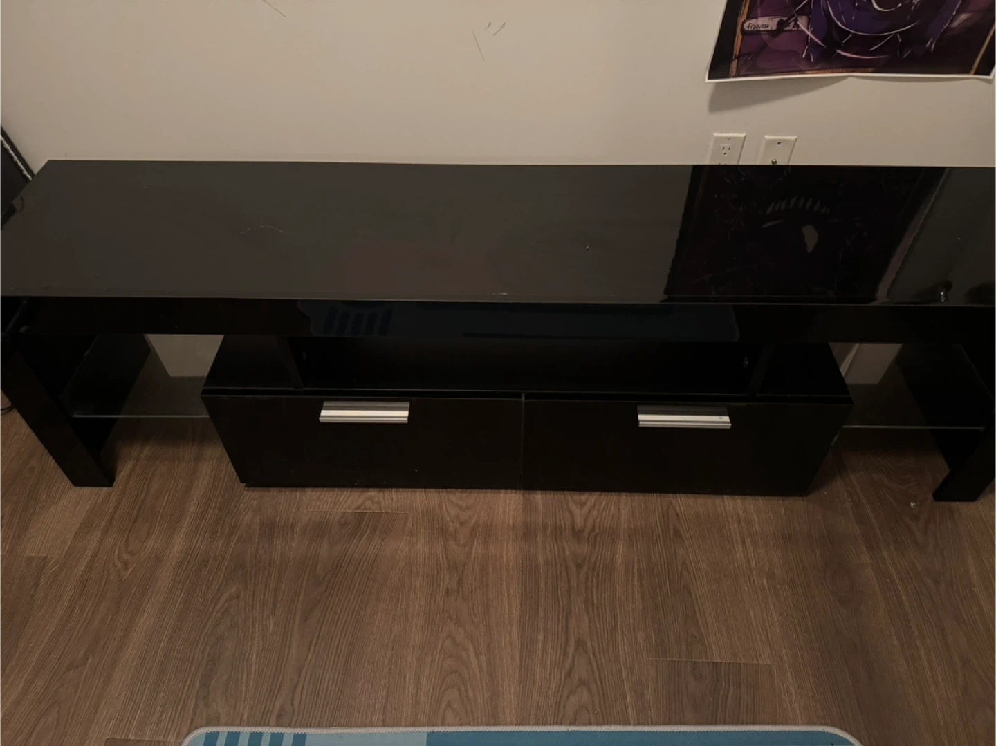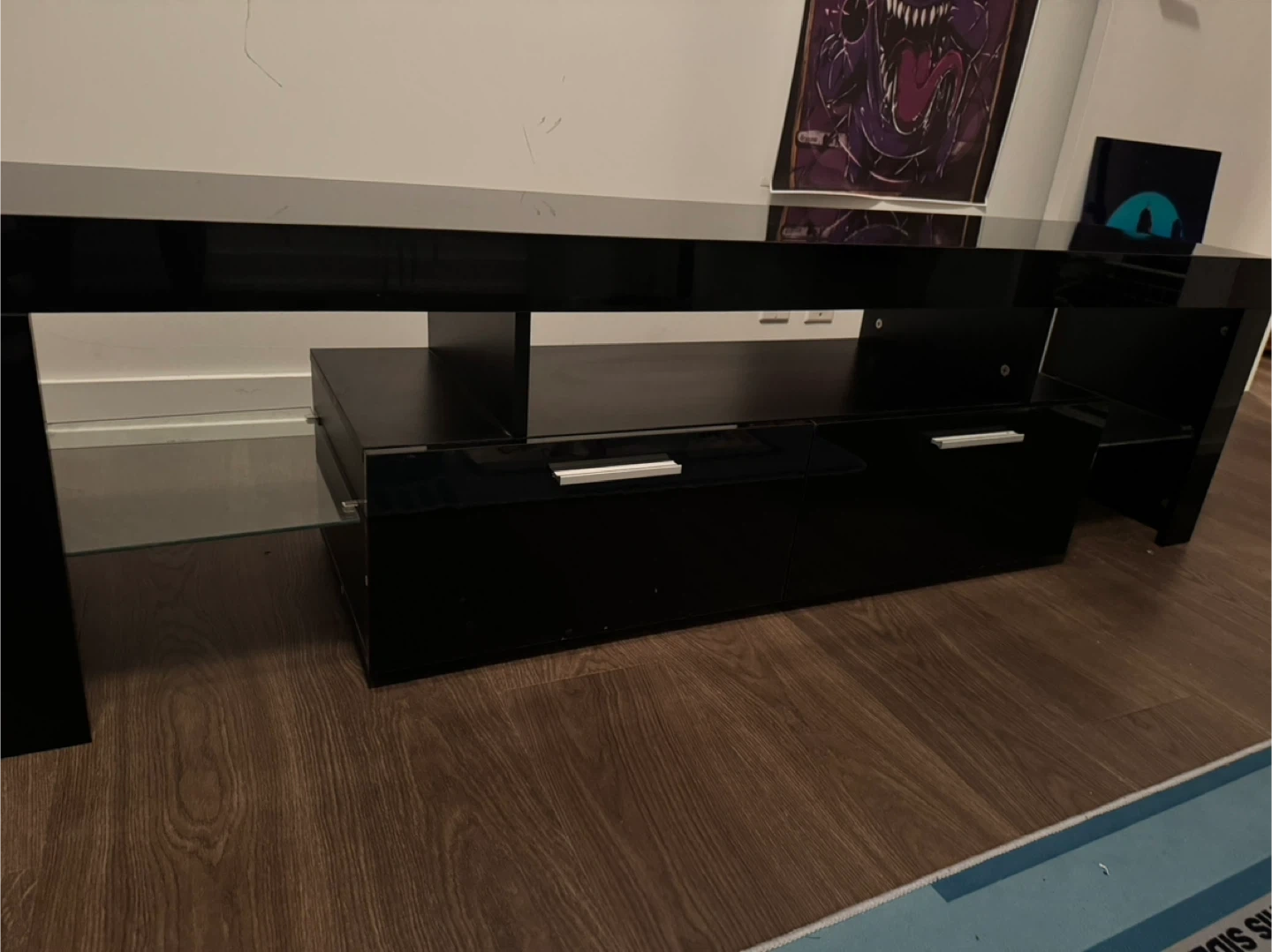 Glossy black entertainment unit. It has two drawers with silver handles and open shelving space. This unit's sleek design fits most living rooms.