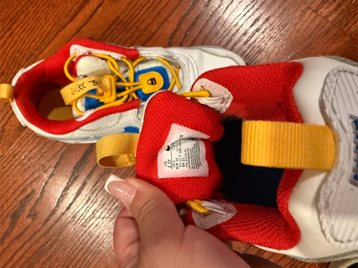 Selling a pair of Nike Air Max 90 sneakers in white, blue, and red! These are a youth size 2.5Y and are in great condition. They feature a unique lacing system and the classic Air Max cushioning for comfort.
