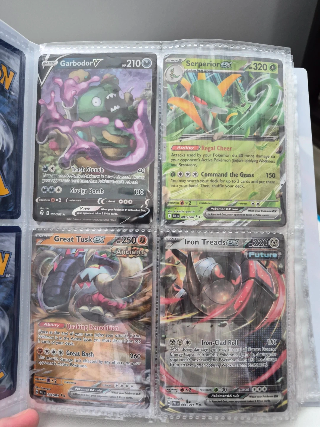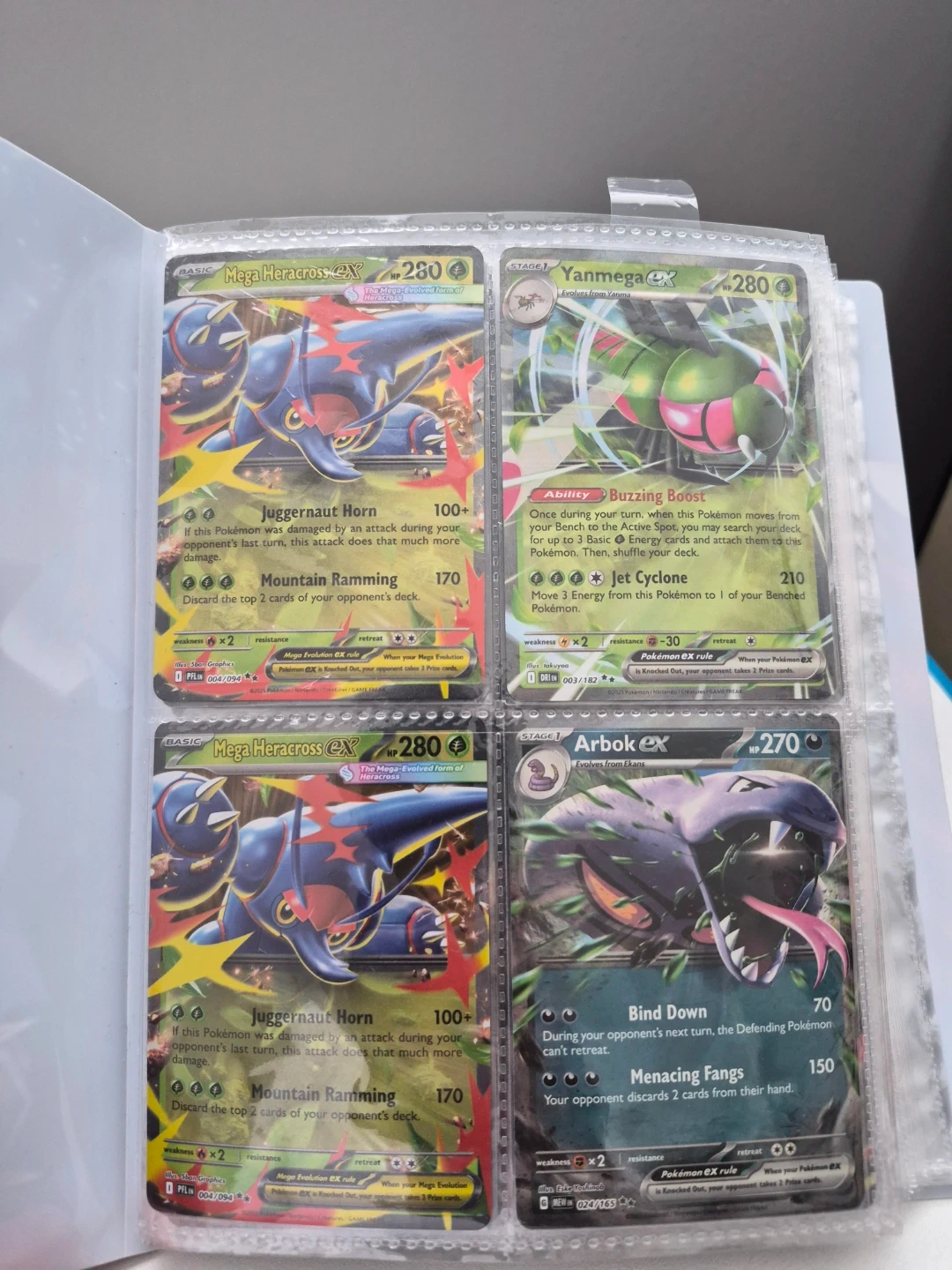 This is a collection of various Pokemon EX trading cards. It includes characters like Mega Heracross EX, Yanmega EX, Arbok EX, Garbodor V, Serperior EX, Great Tusk EX, and Iron Treads EX. Some cards are in Japanese. These cards are great for collectors and Pokemon fans alike. Will price accordingly from collector app.