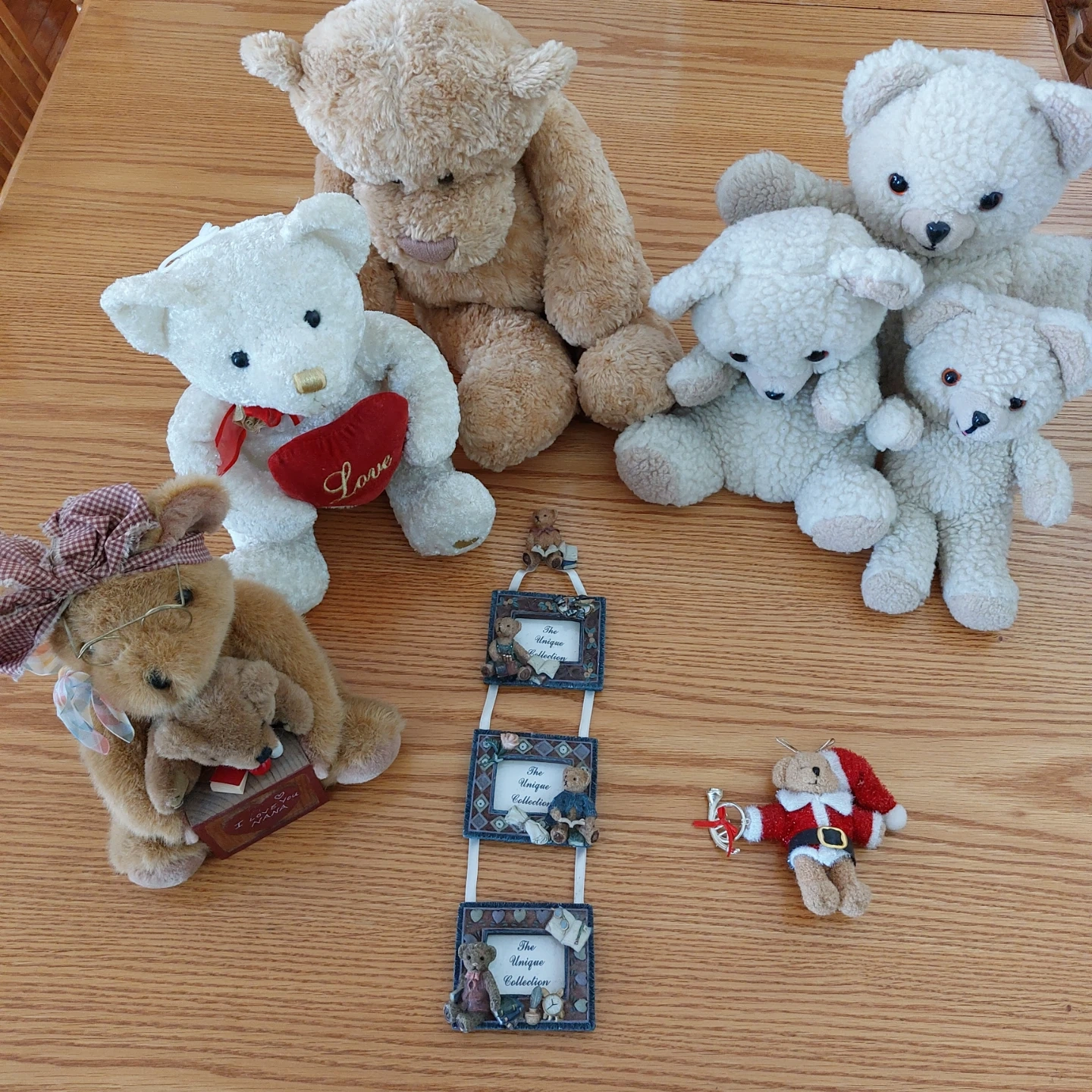 Collection of plush teddy bears in various sizes and colours. Includes a festive Santa teddy and a decorative keepsake photo frame with three small picture slots. Made with soft, durable materials.