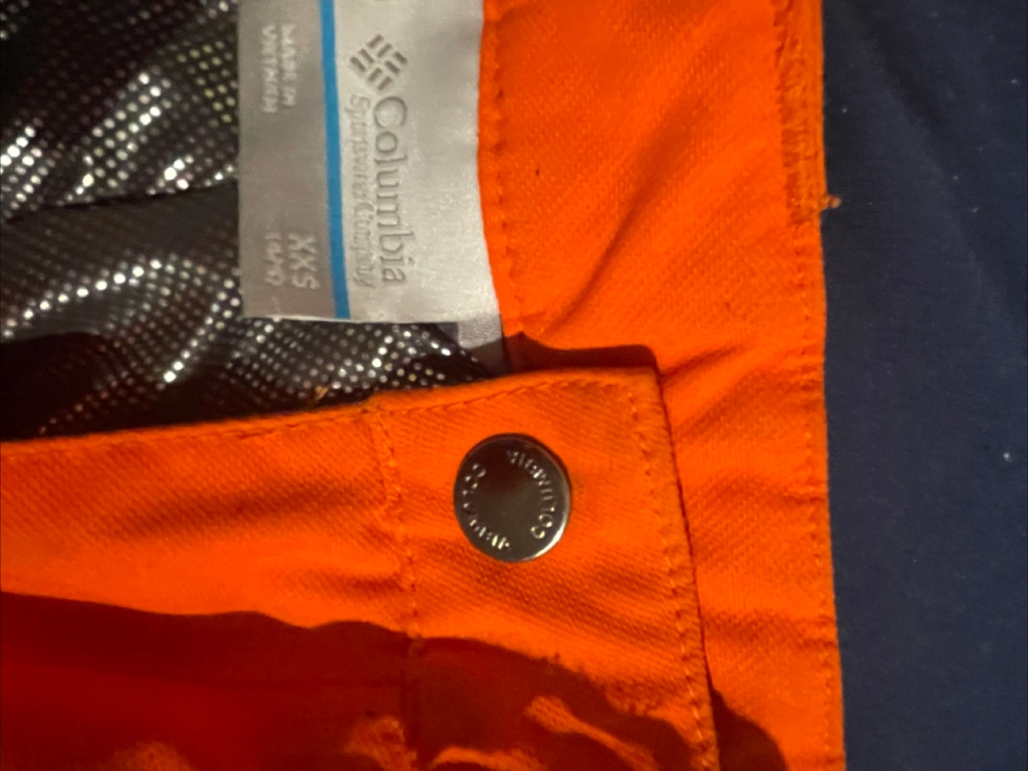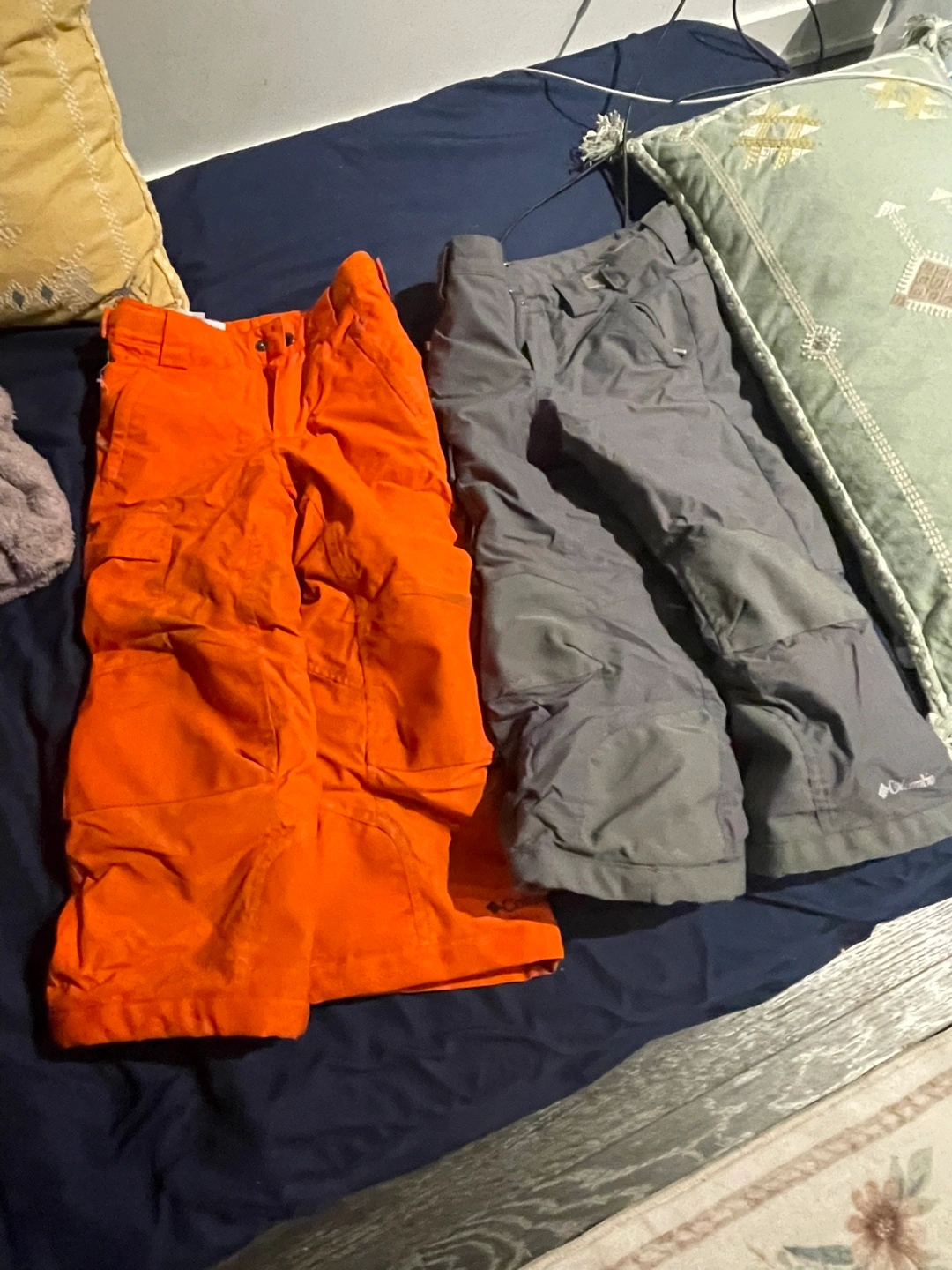 Two pairs of kids' ski pants from Columbia. One pair is bright orange and the other is grey. Both are in size XXS (6/8). Perfect for keeping warm and dry on the slopes!