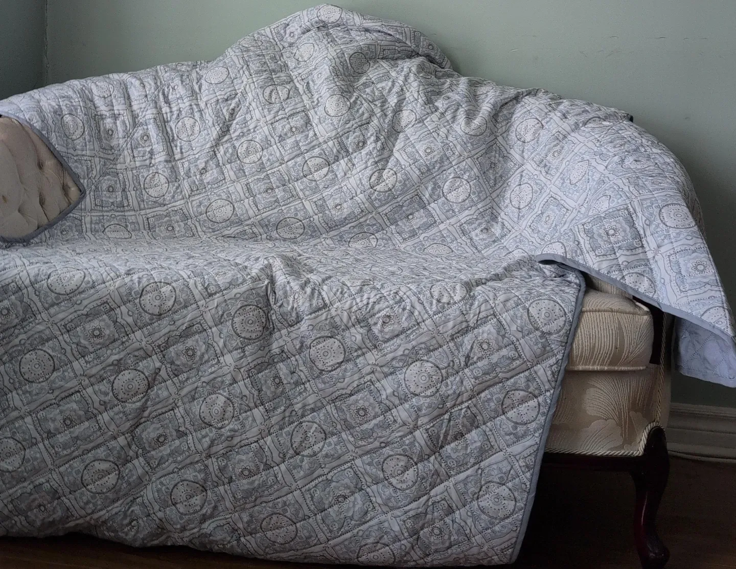 This is a quilted throw for a sofa covers. It has a grey and white patterned design. It's made from a soft fabric.