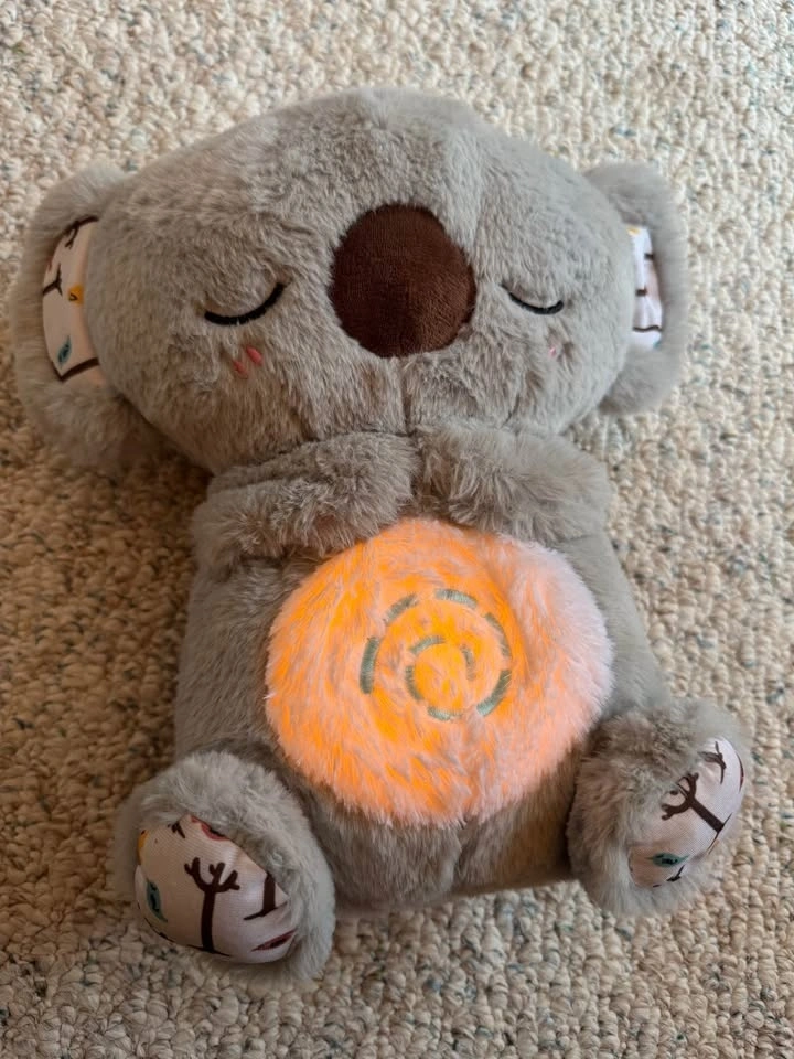 This Evora Koala Bear plush toy is 10 inches and "breathes." It has different sound effects you can choose to help calm and soothe. Let me know if you're interested!