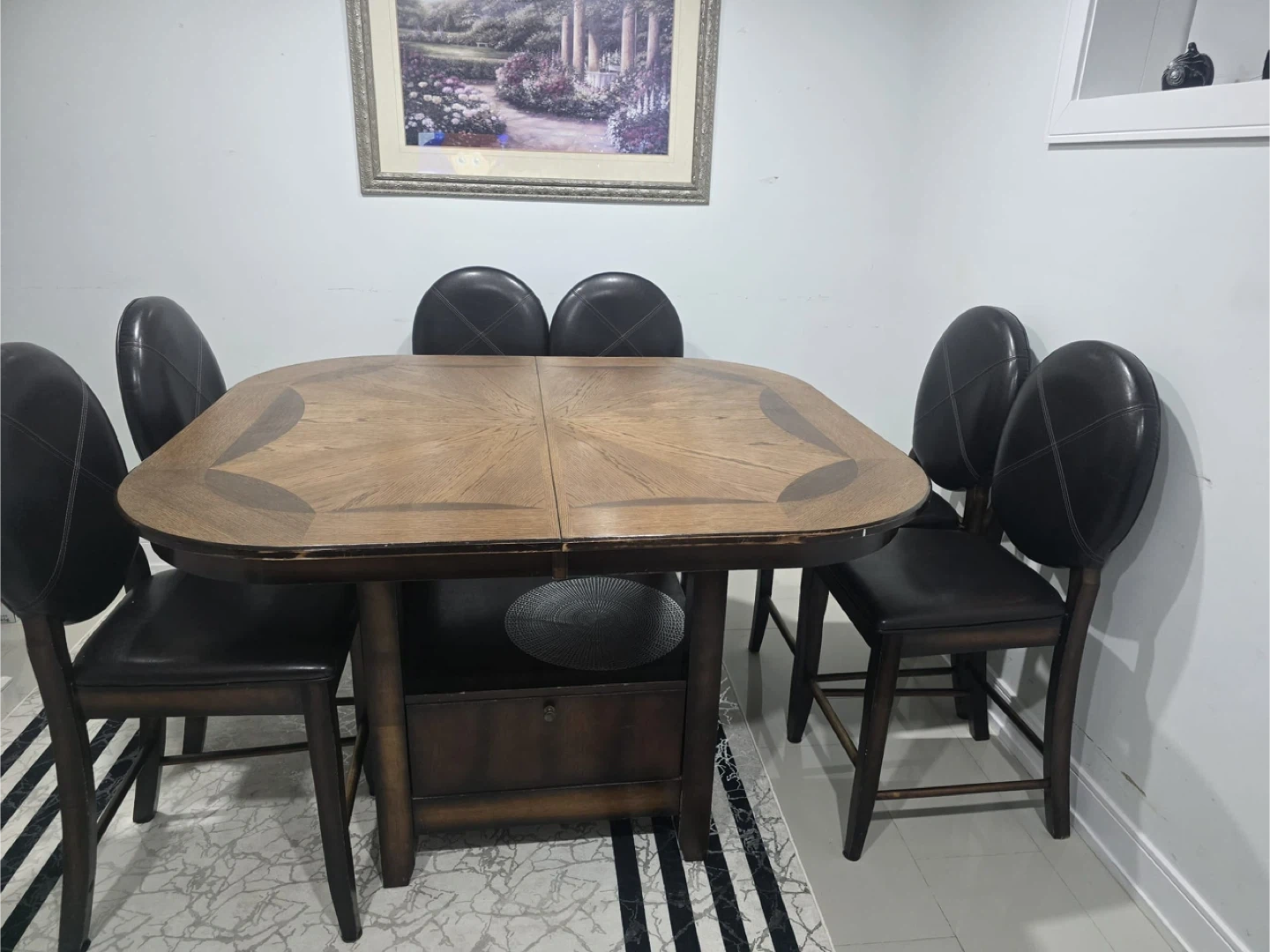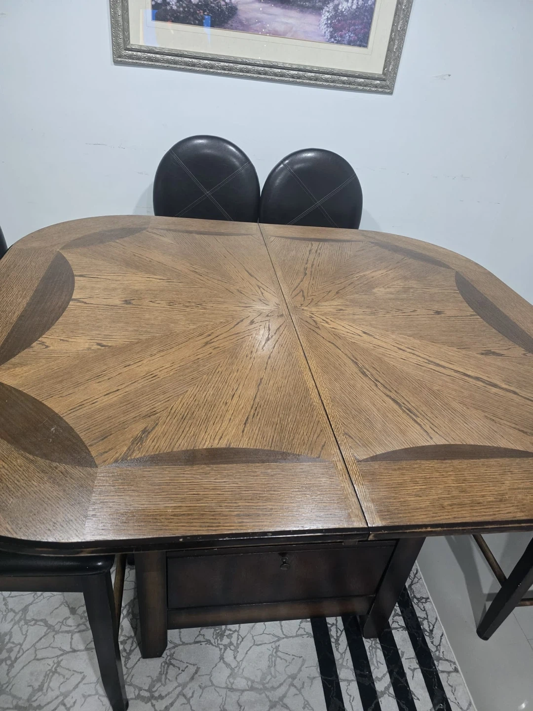 A lovely wooden dining table featuring a distinct sunburst pattern on the surface. It includes a convenient storage drawer built into the base. Perfect for family meals or hosting friends! Six high, wide-seated leather-covered chairs and an extendable table.