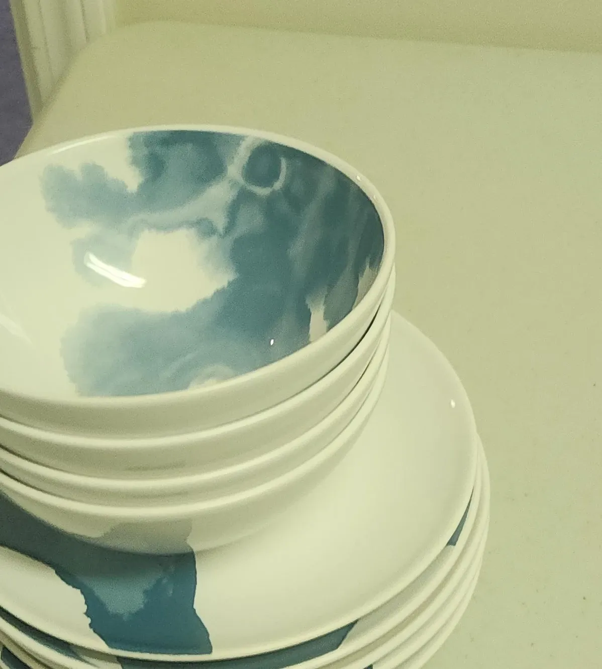 A set of white ceramic bowls and plates featuring a blue swirled design inside the bowls and on the exterior of the plates. Dishwasher and microwave safe. Comes with 4 bowls and 4 plates. From Ikea.
