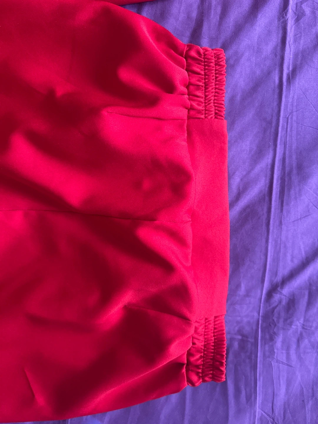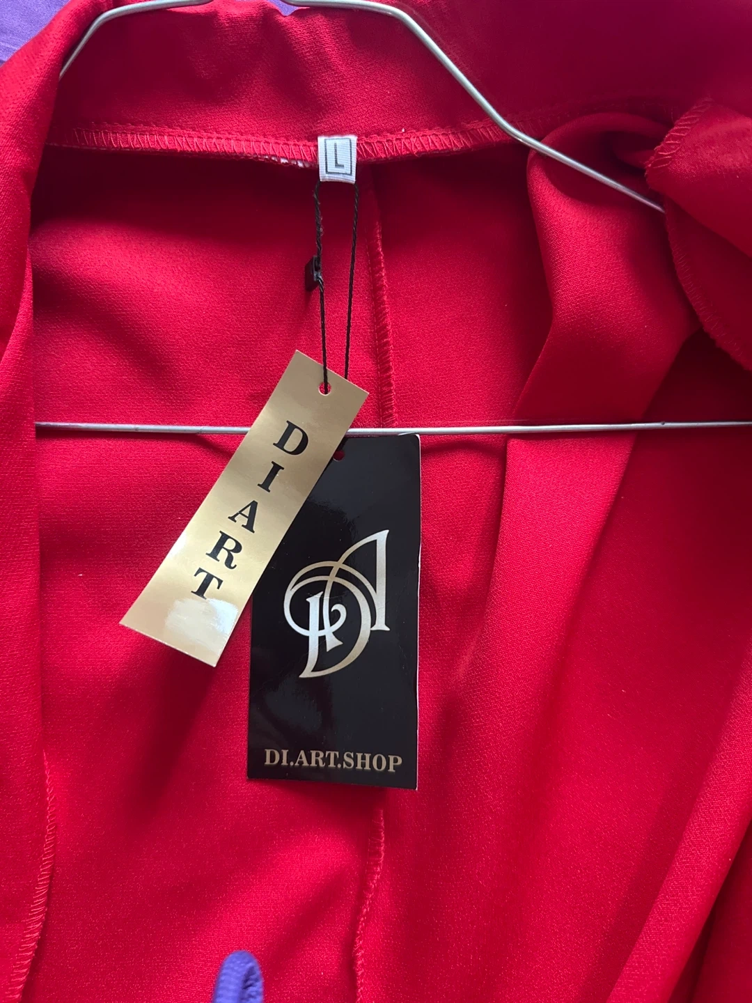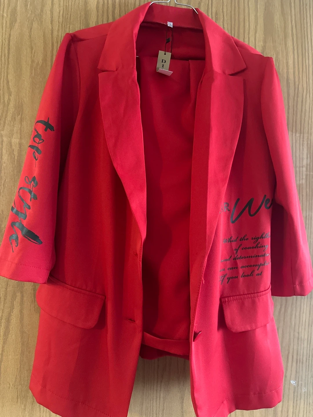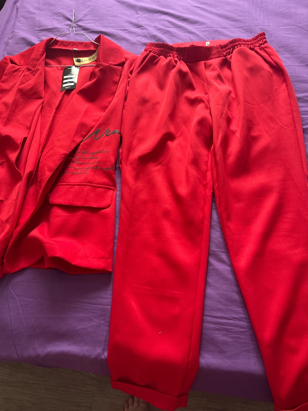 This is a red blazer and pants set from DI.ART. The blazer is size L and features text detail on the sleeves and front pocket. The pants have an elastic waistband for comfort. It's a stylish two-piece outfit.