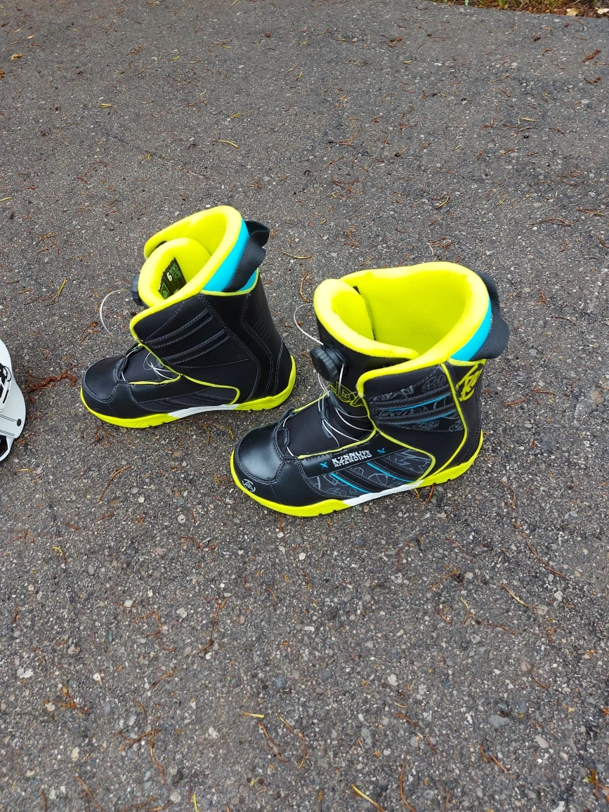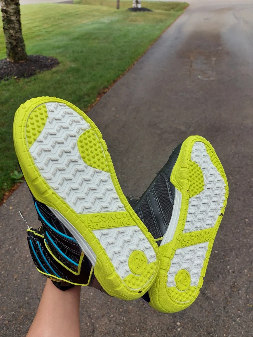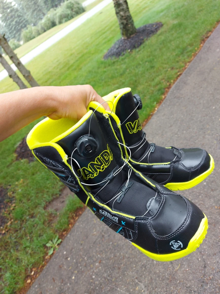 Black and neon yellow K2 snowboard boots. These boots feature a BOA lacing system for a secure fit. They're designed for snowboarding. Great for hitting the slopes!