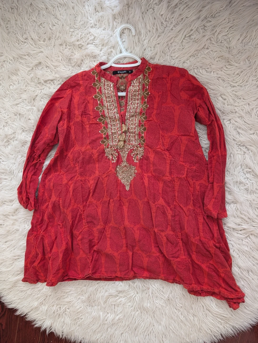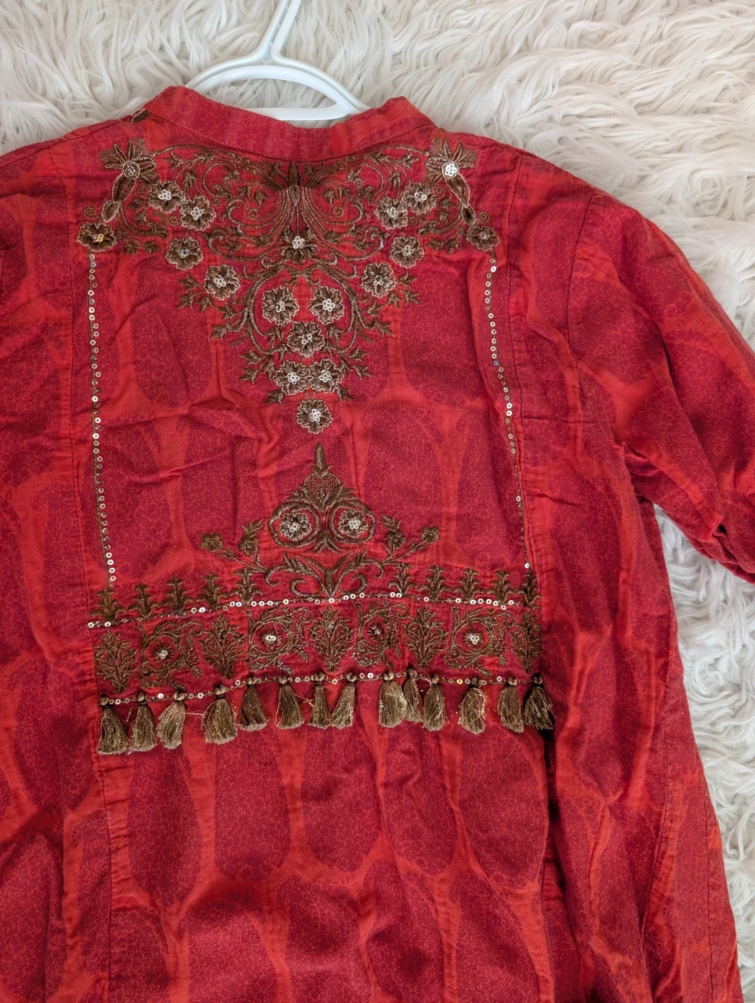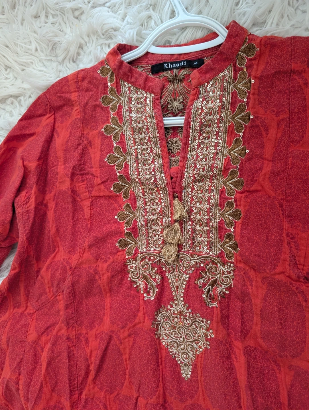 This Khaadi tunic is burnt orange with intricate gold and brown embroidery on the front and back. It features sparkly sequins and tassels for added detail. Size is 10. Adds a festive touch to any wardrobe!
