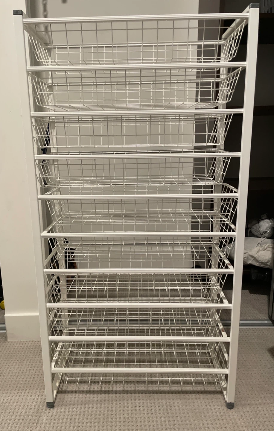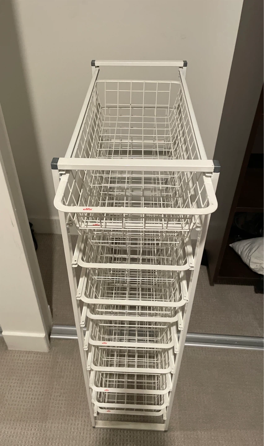 White Elfa metal wire basket storage unit with 10 shelves. It's great for organizing clothes, linens, or pantry items. This unit measures 41 inches tall. Each shelf is 3” deep, ideal for scarves, gloves and accessories.