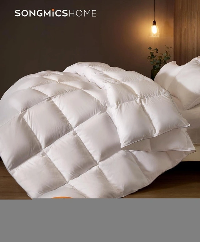 Get ready to snuggle up in ultimate comfort with this brand new SONGMICS HOME down comforter, perfectly sized at 90x90 inches for a queen bed. This white comforter promises warmth and coziness for a restful night's sleep.