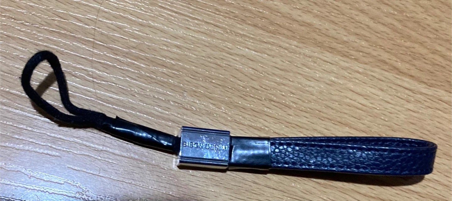 BISON DENIM leather keychain. It's dark blue and has a metal clasp. Material is genuine leather. This keychain is useful for keeping keys secure and accessible.