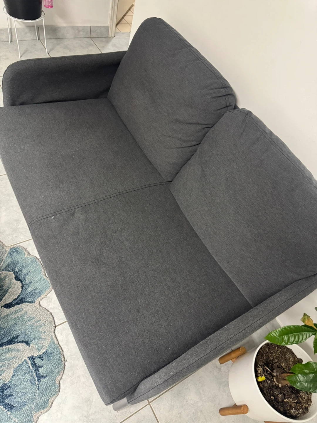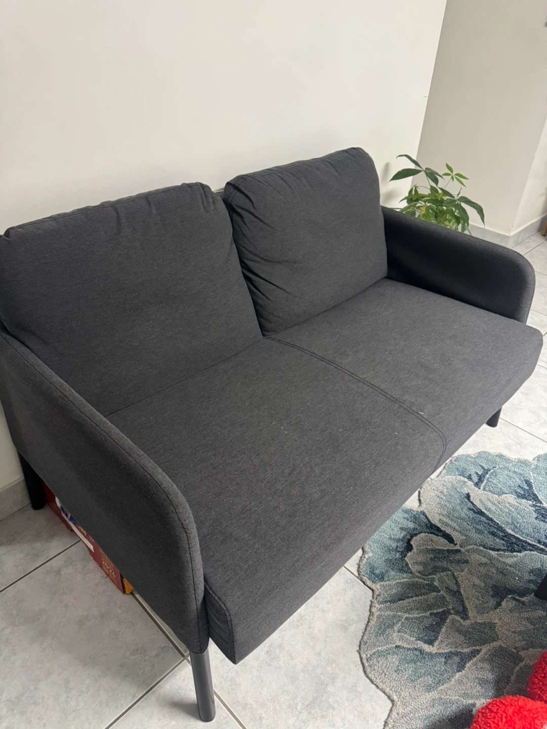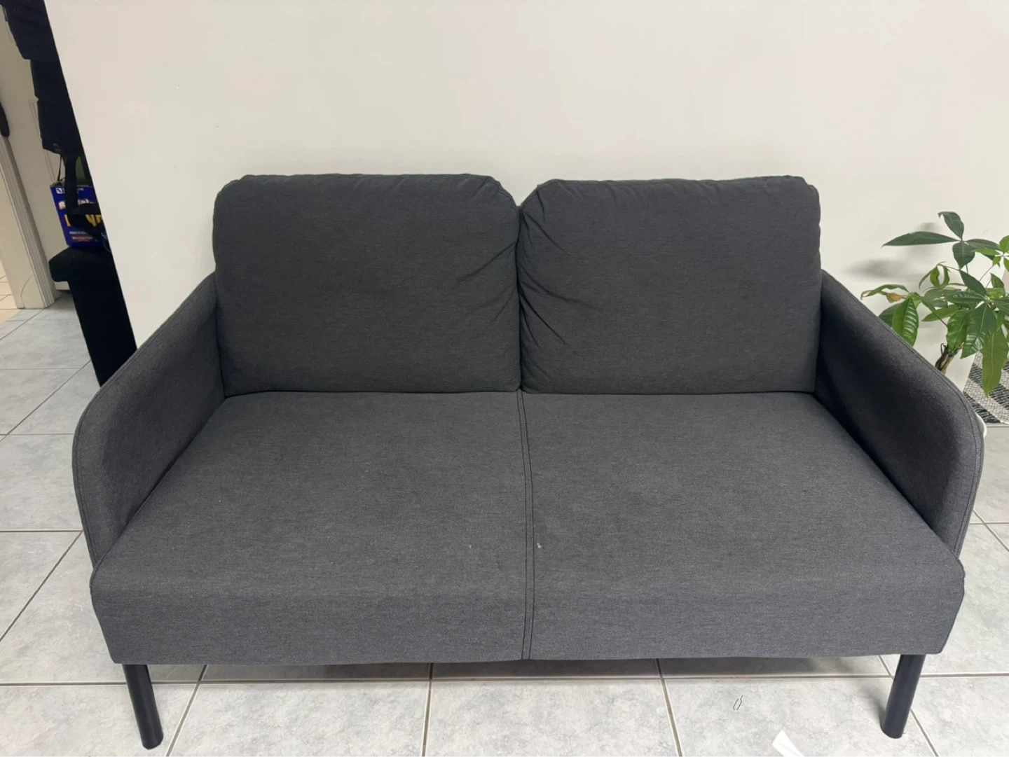 A modern, dark grey fabric two-seater sofa. Its clean lines and minimalist design make it a versatile addition to any living space. This sofa offers comfortable seating for two.