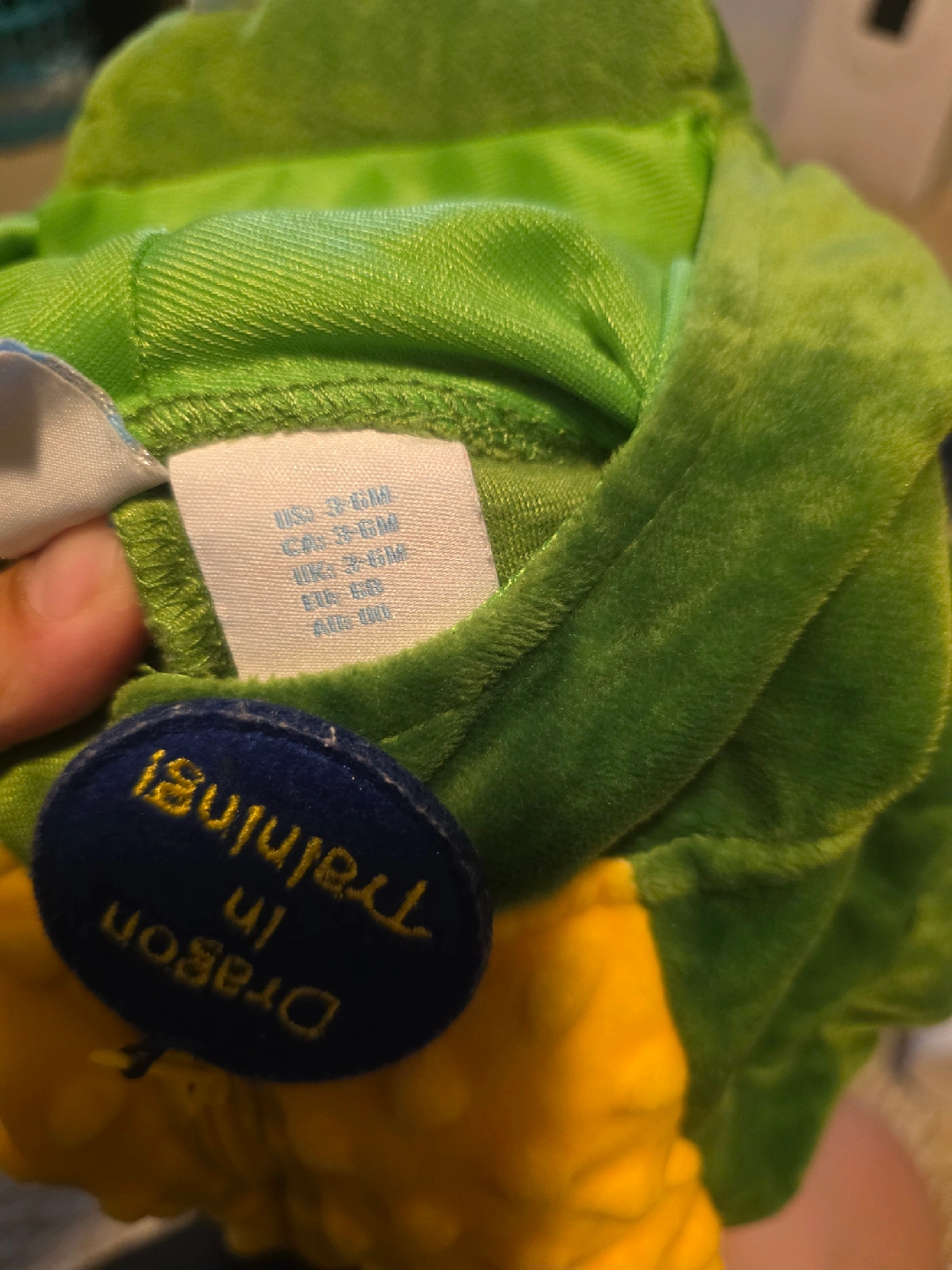 Selling a cute dragon costume, perfect for your little one! It's sized for 3-6 months. The costume is green with yellow accents and has a hood with dragon details. It's in great condition and ready for a new home!