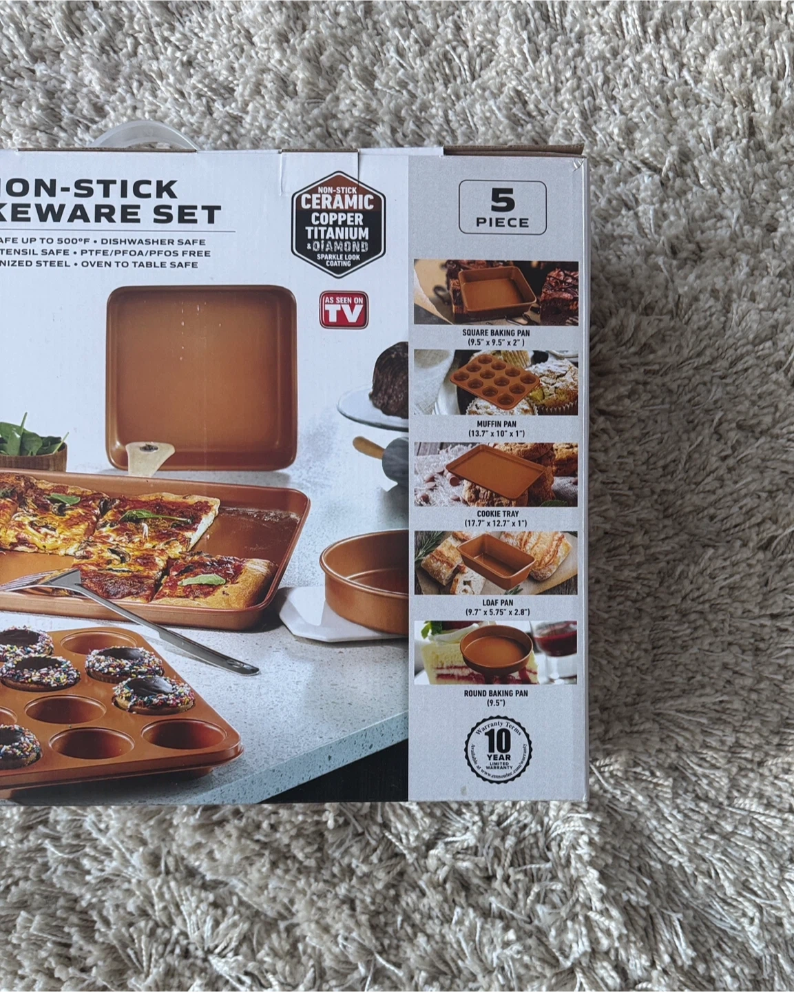 This 5-piece bakeware set includes a cookie sheet, loaf pan, square baking pan, round baking pan, and muffin pan.
