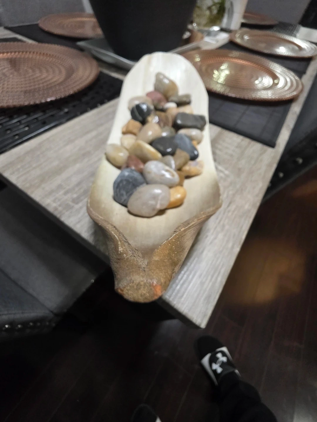 A collection of smooth, polished river stones displayed in a rustic wooden bowl. These stones offer a natural touch to any home decor. They can be used to fill vases, accent centrepieces, or create a calming zen garden display.