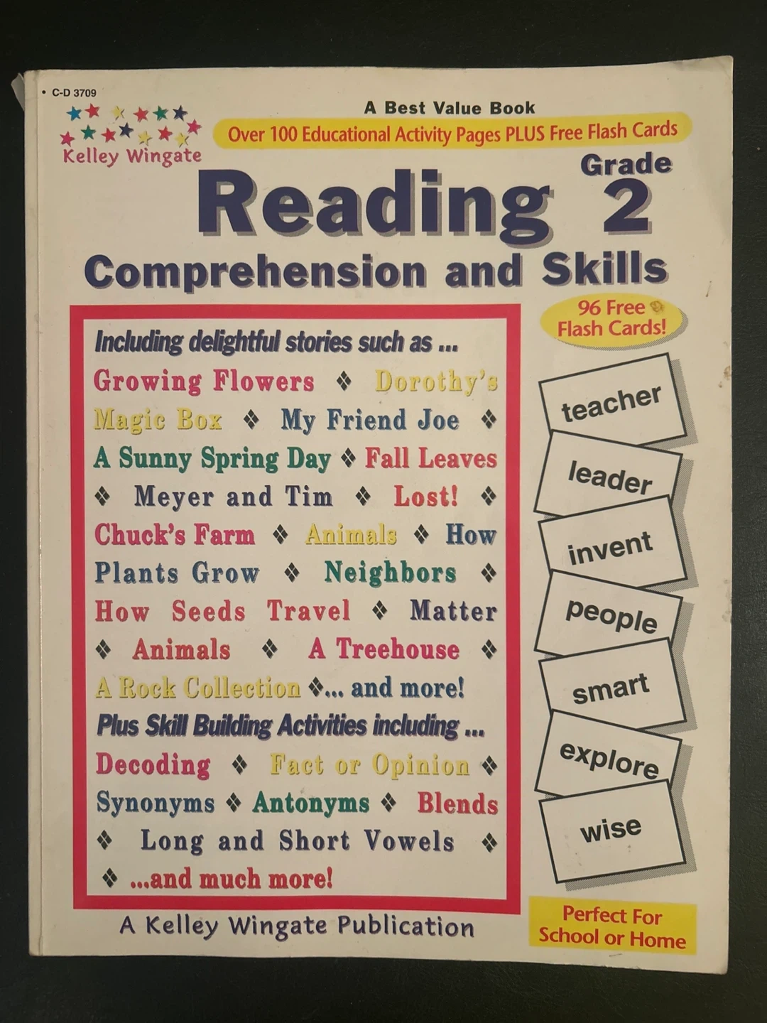 A Kelley Wingate "Reading Comprehension and Skills" workbook for Grade 2. Includes over 100 educational activity pages and 96 free flash cards. Covers delightful stories, skill-building activities, decoding, synonyms, antonyms, and blends.