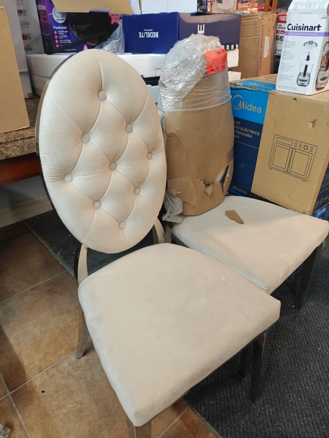 Brand New - These cream upholstered dining chairs feature a stylish tufted back design and sturdy metal legs. They're perfect for adding a touch of elegance to your dining room. The seat and back are cushioned for comfort.