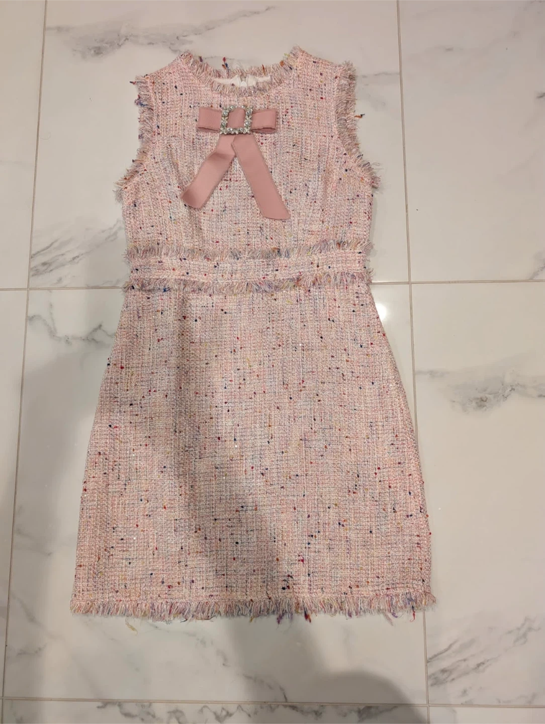 Pretty pink tweed sleeveless dress. Features a contrast ribbon bow with rhinestone embellishment at the neckline and frayed trim details. Material is a textured blend, perfect for a stylish look.