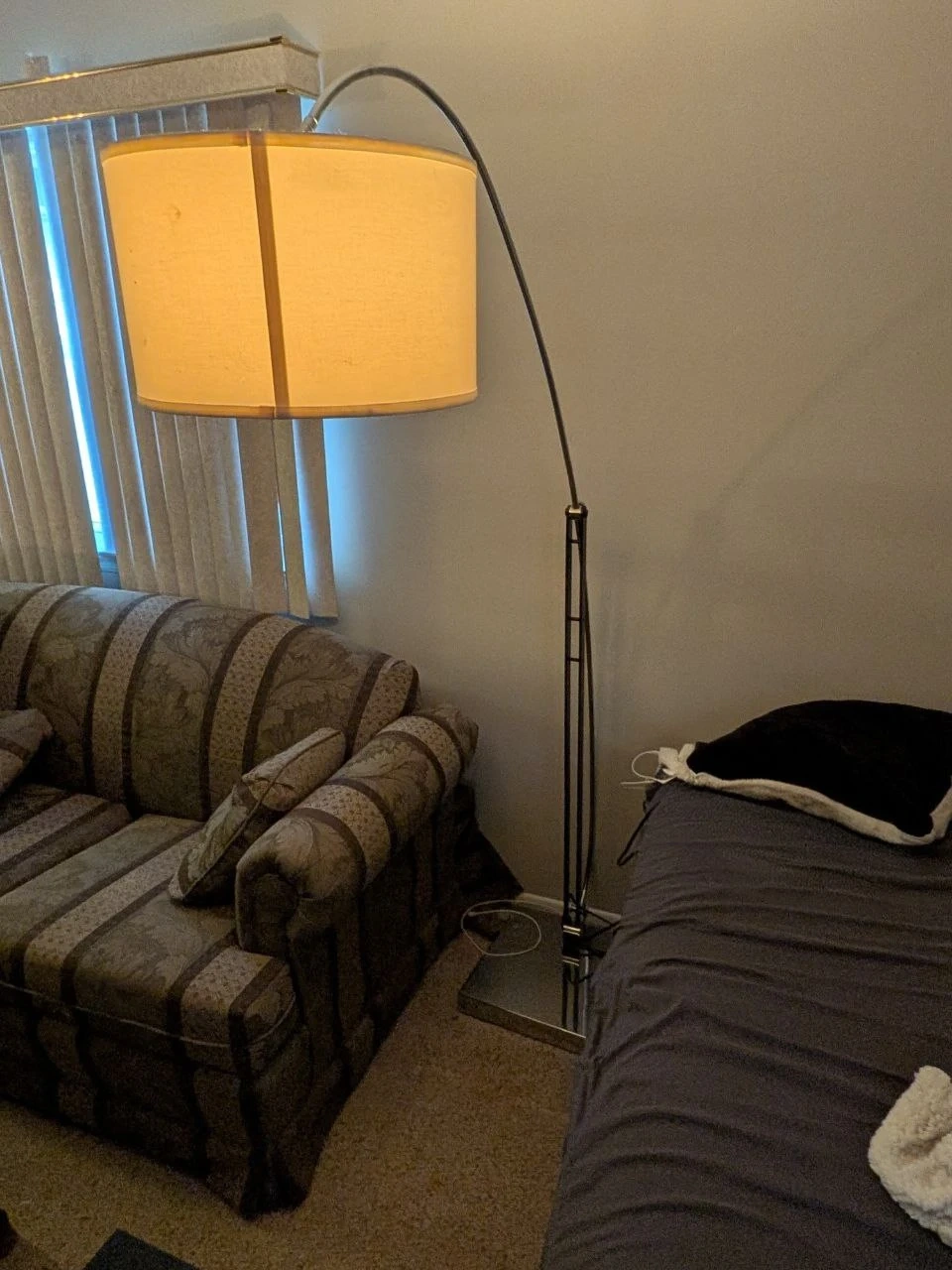 This arc floor lamp provides overhead lighting. It features a metal pole and a drum-shaped fabric shade. A wide base offers stability. Perfect for living rooms or reading nooks!