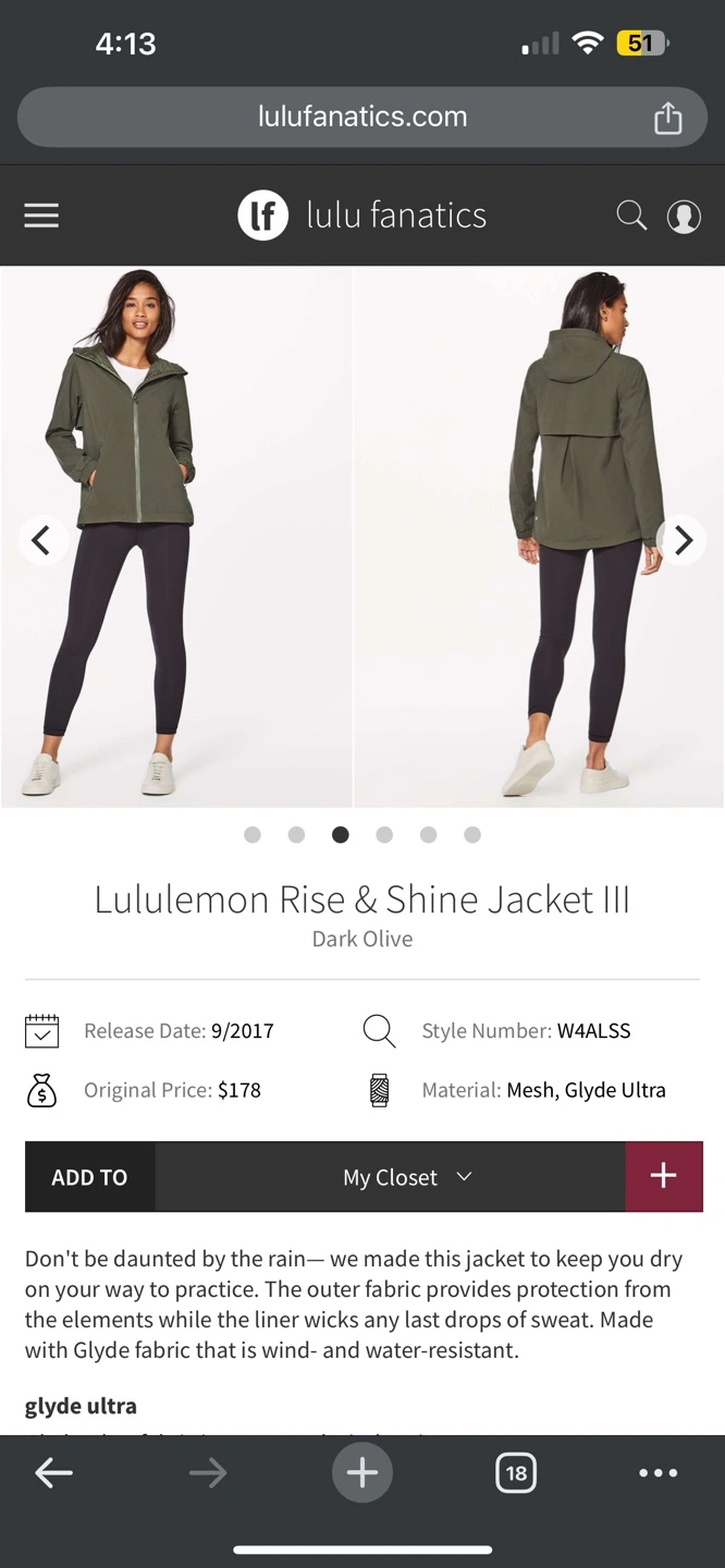 Lululemon jacket in dark olive. Features a hood and zipper closure. Made with wind and water-resistant material.